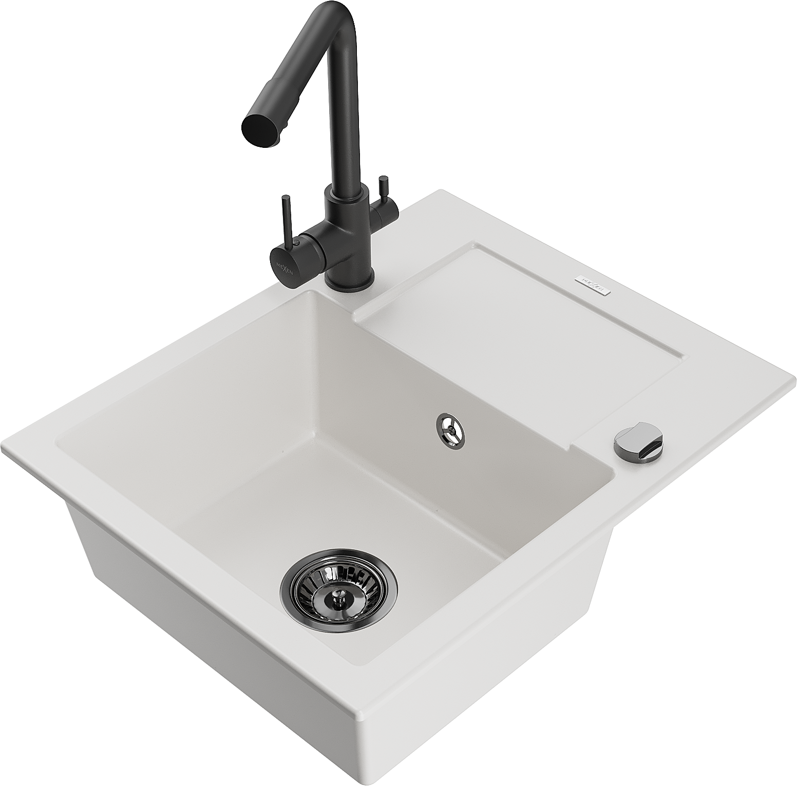 Mexen Enzo granit izlietne ar vienu nodalījumu, noteku un virtuves jaucējkrānu Duero, balts - 6506-20-671600-70