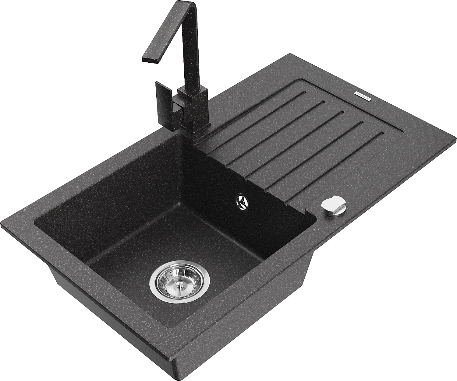 Mexen Pablo granitizlietne ar vienu nodalījumu, noteces vietu un virtuves jaucējkrānu Rita, melna ar plankumiem