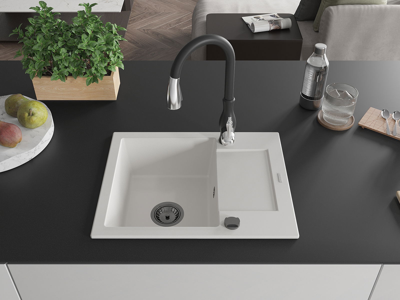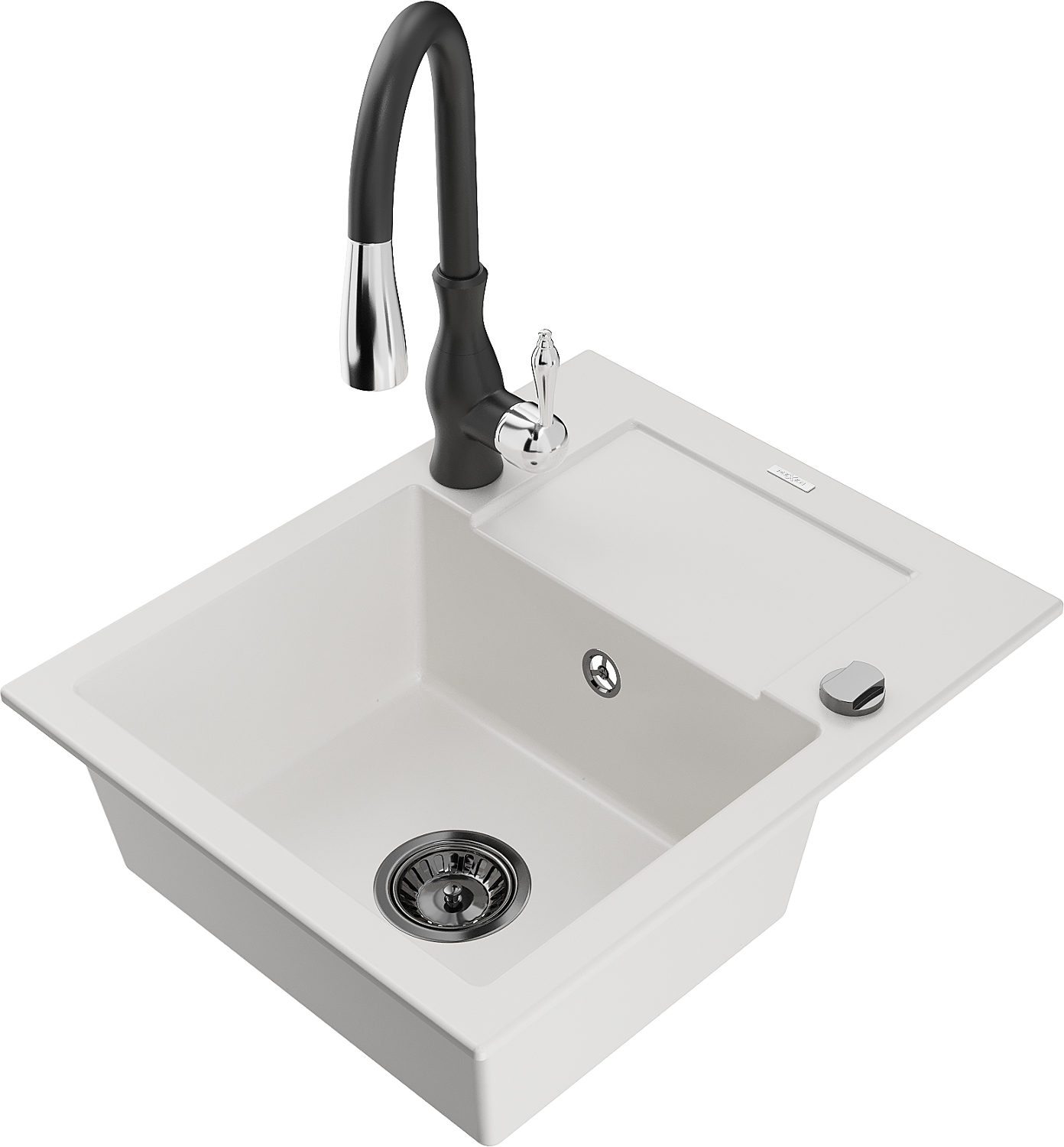 Mexen Enzo 1-kameru granīta izlietne ar noteces paliktni un virtuves jaucējkrānu Savita, balta - 6506-20-672601-70