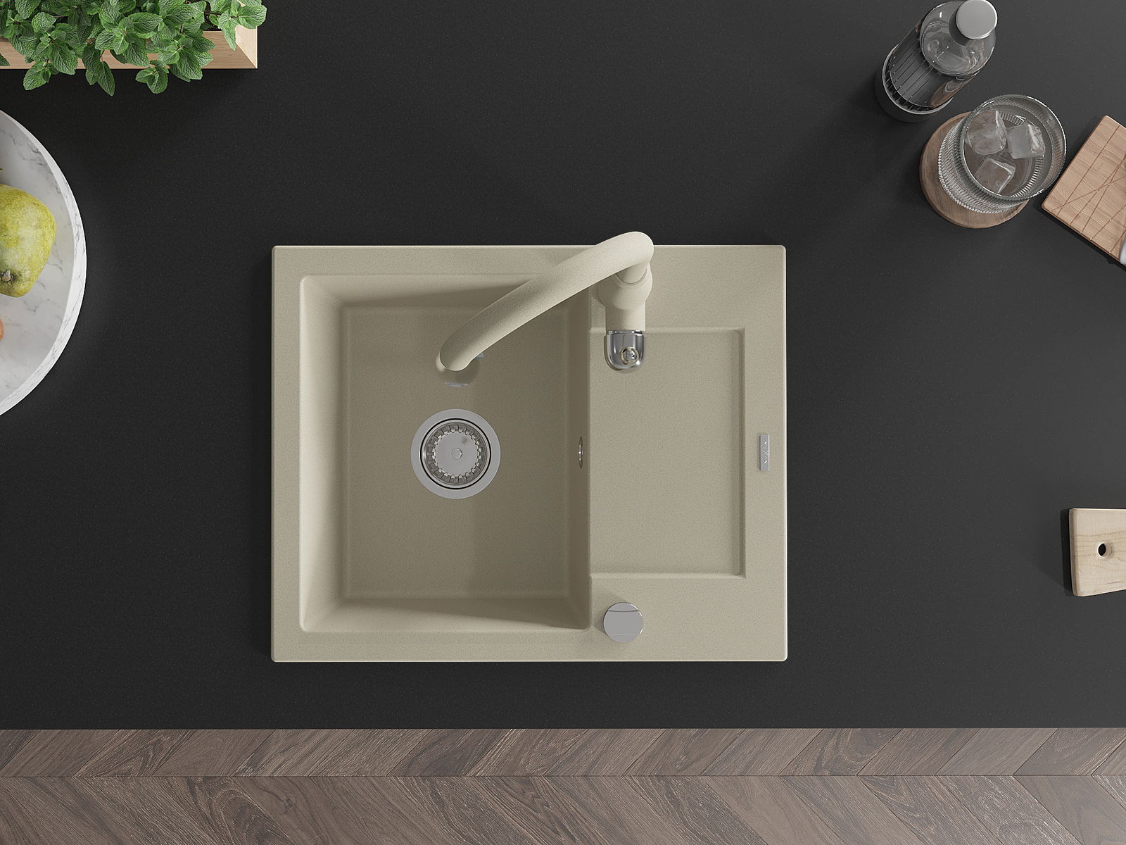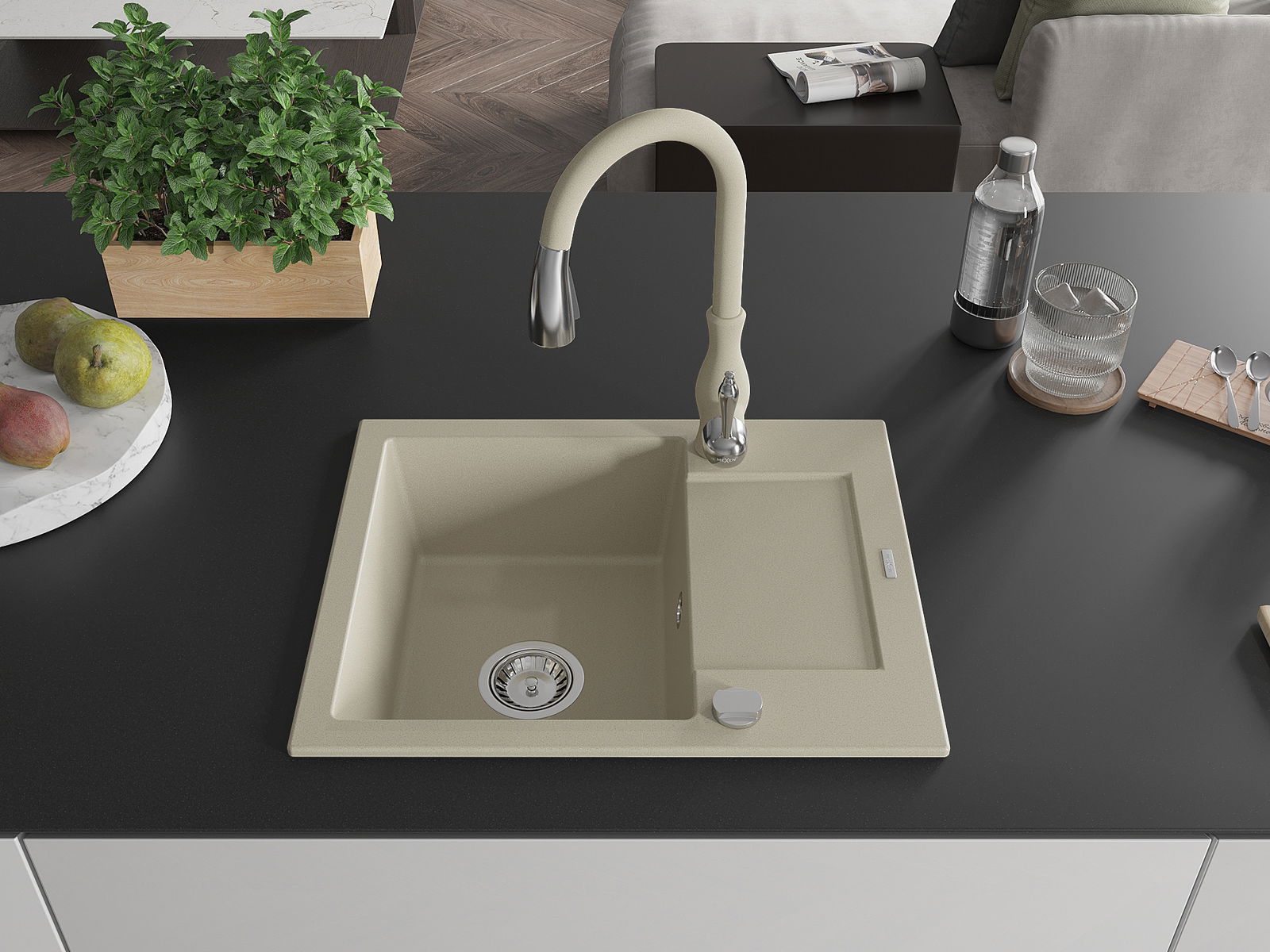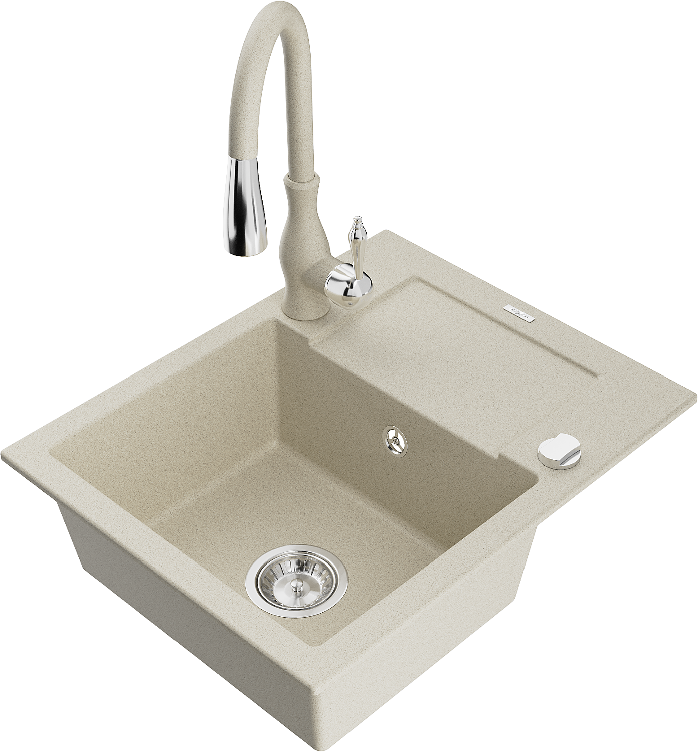 Mexen Enzo granitā izlietne ar vienu nodalījumu, ar noteci un virtuves jaucējkrānu Savita, bēšs - 6506-69-672601-69