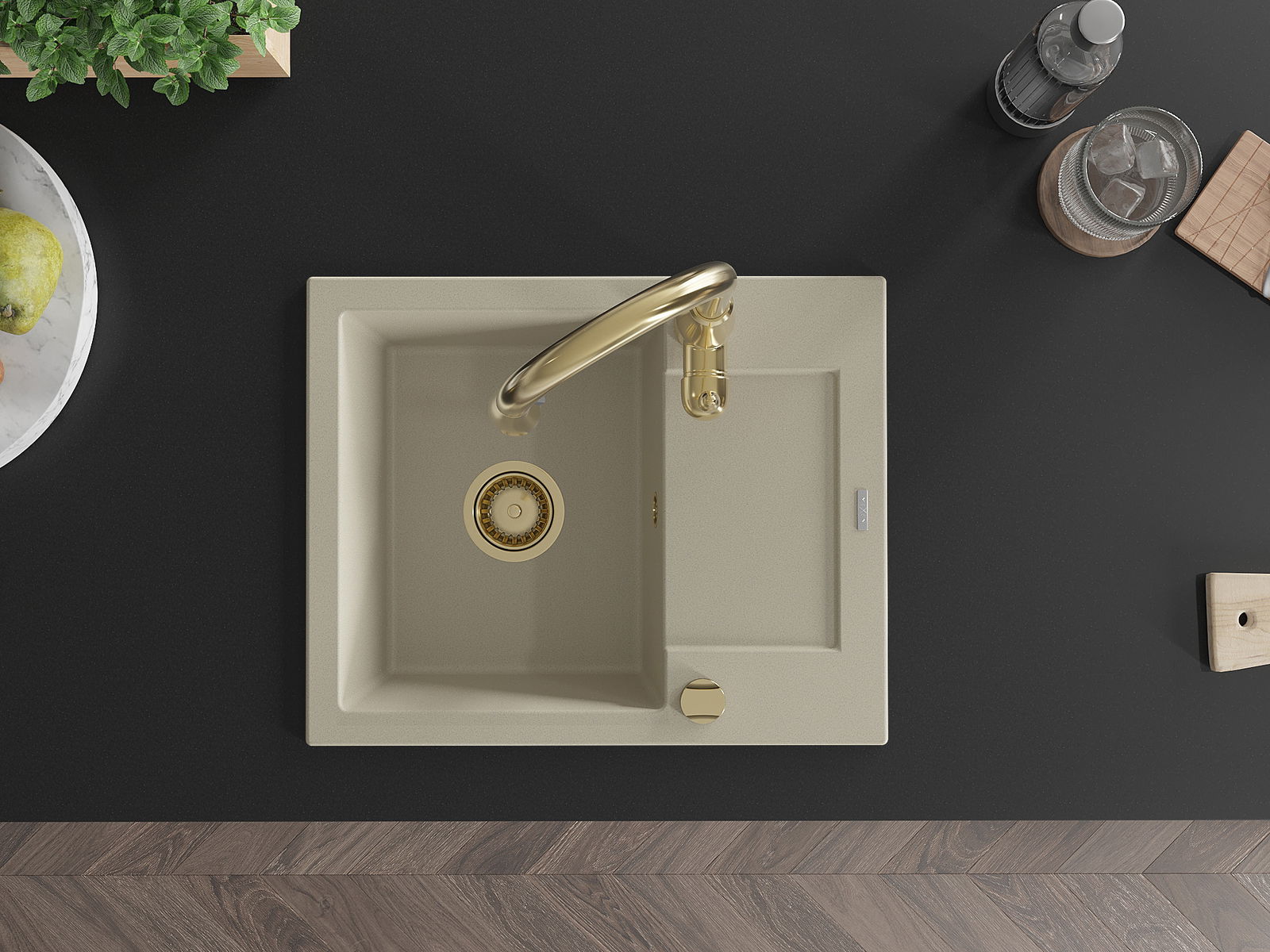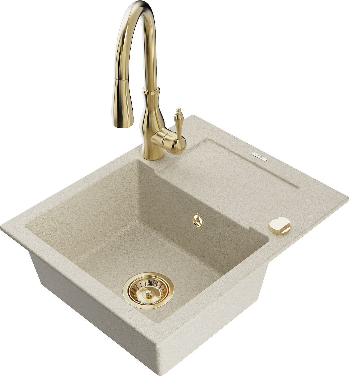 Mexen Enzo grānīta virtuves izlietne ar vienu bļodu, notecinātāju un virtuves jaucējkrānu Savita, bēša - 6506-69-672601-50