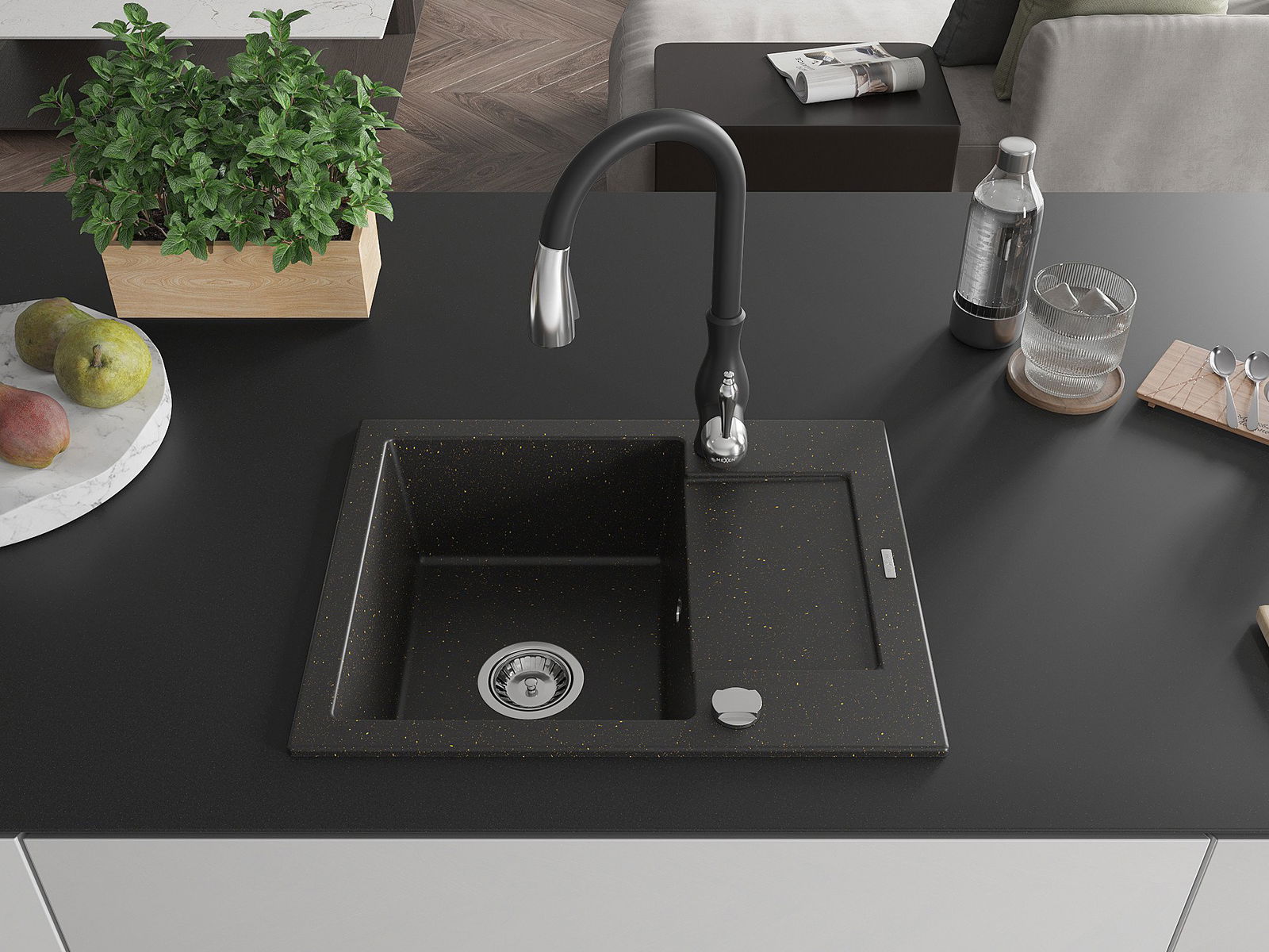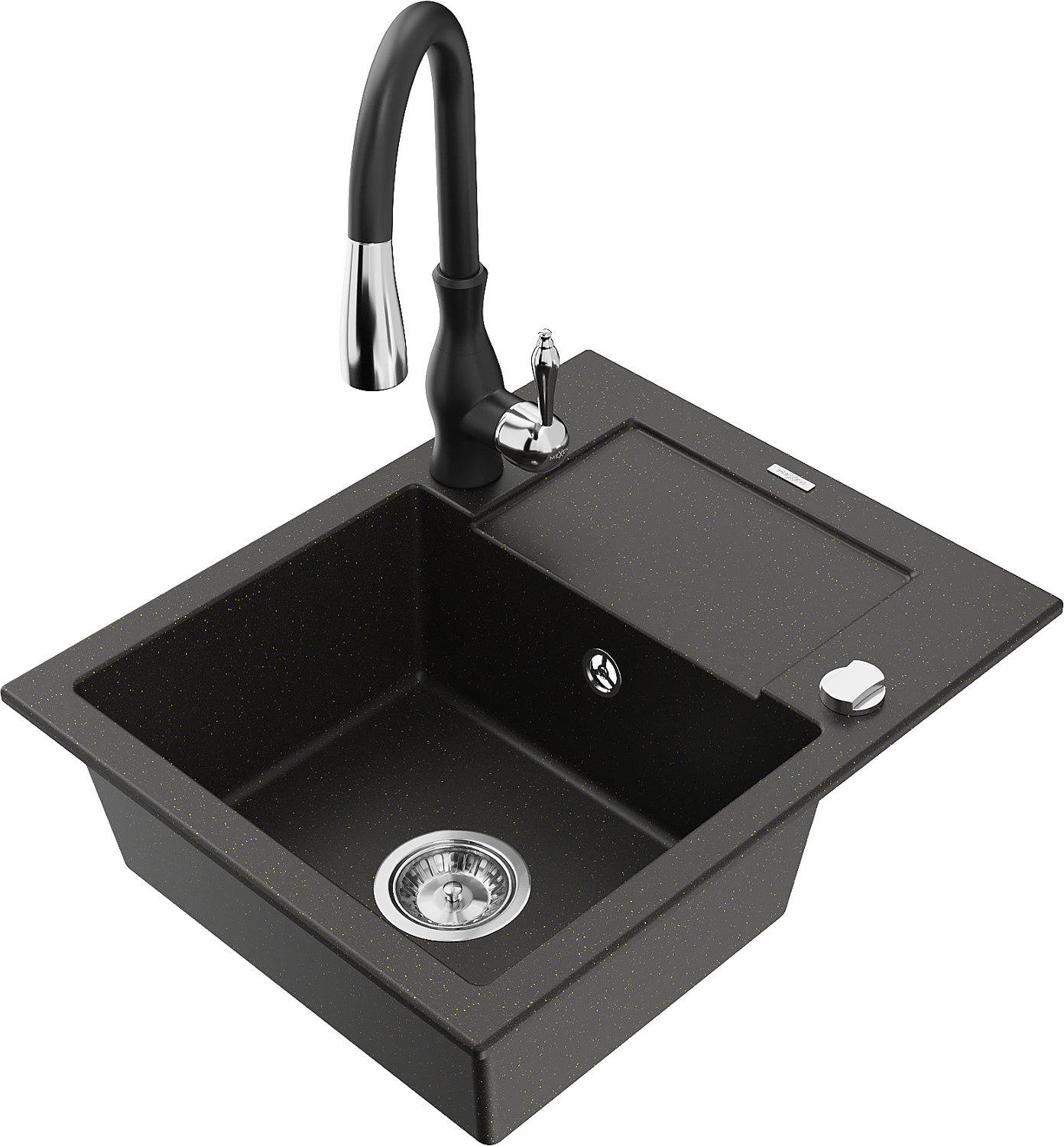 Mexen Enzo grana izlietne ar vienu nodalījumu, ar noteku un virtuves jaucējkrānu Savita, melns/zelta metālisks