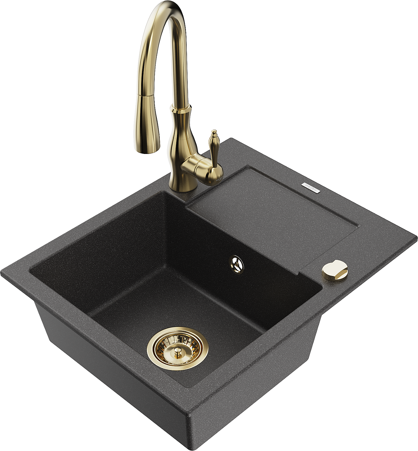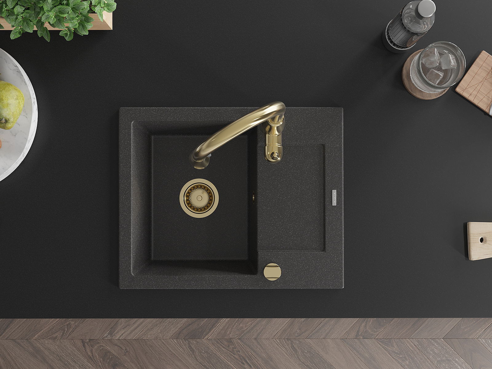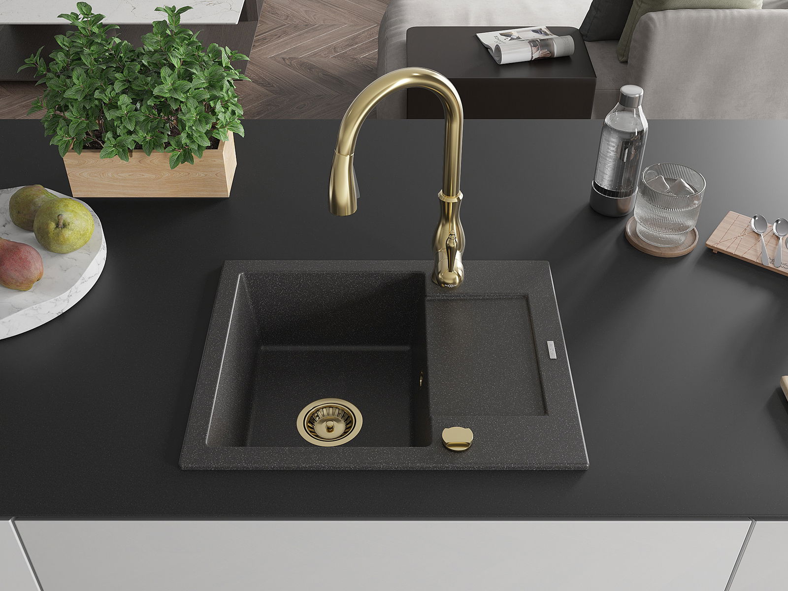 Mexen Enzo granitais izlietne ar vienu nodalījumu, ar notecētavu un virtuves jaucējkrānu Savita, melns ar plankumiem