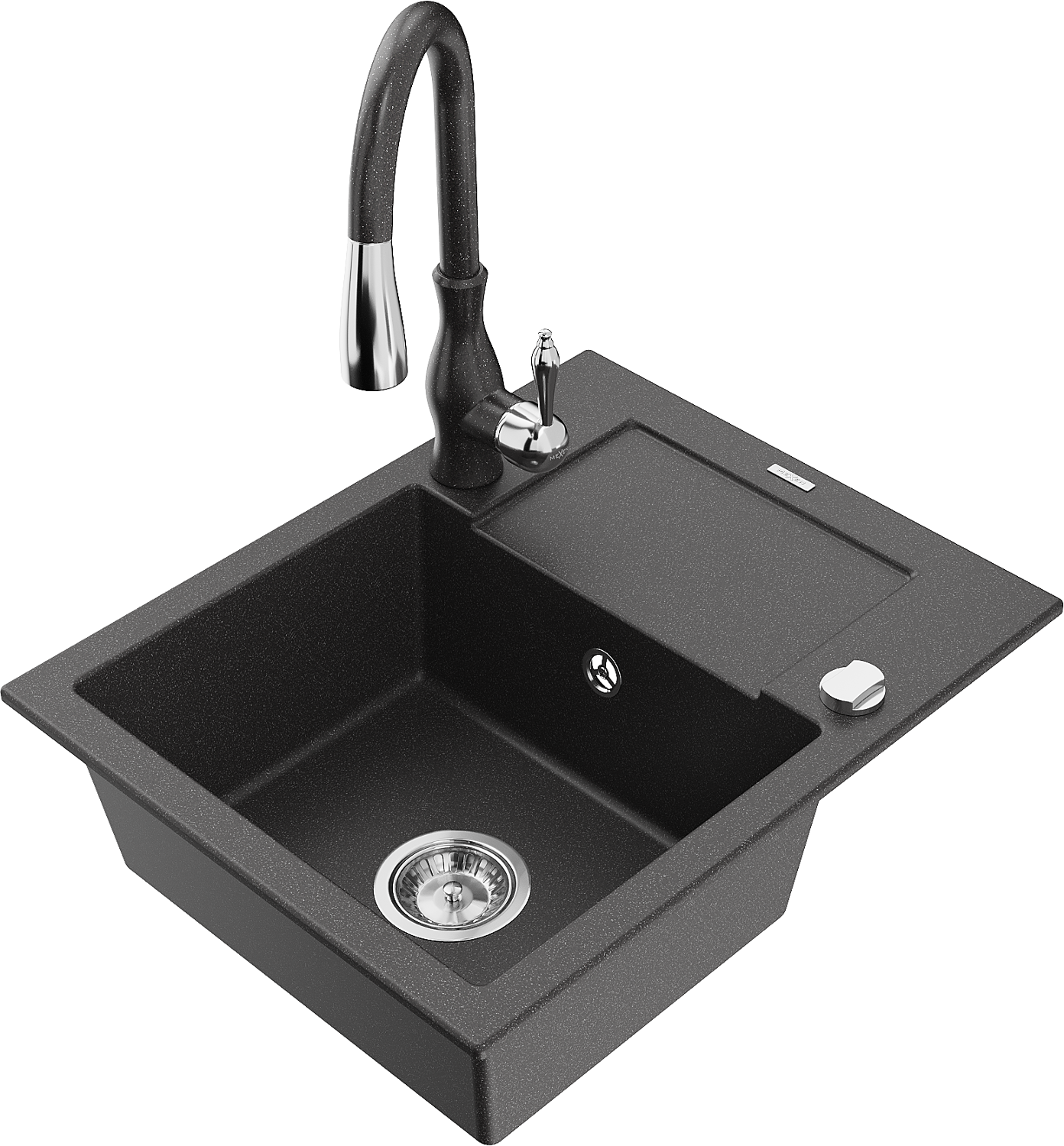 Mexen Enzo granitna viena izlietne ar noteces plāksni un virtuves jaucējkrānu Savita, melna ar plankumiem - 6506-76-672601-76