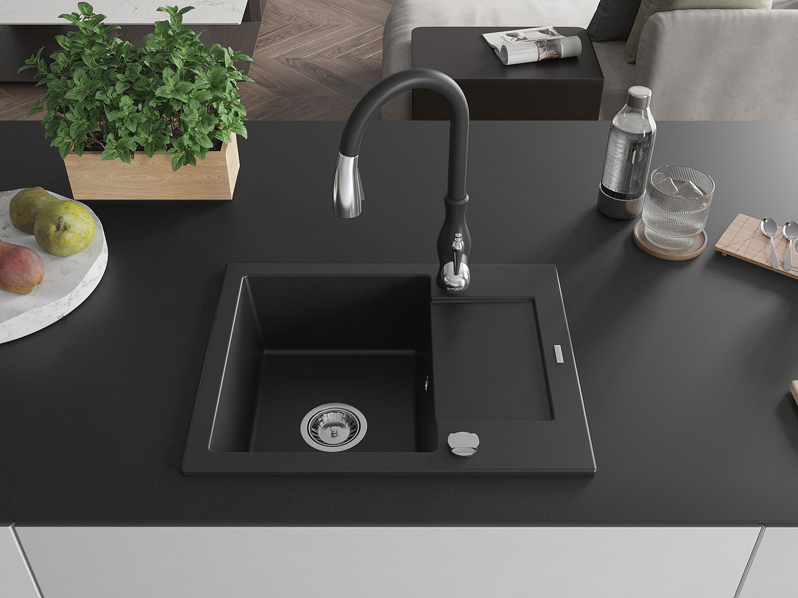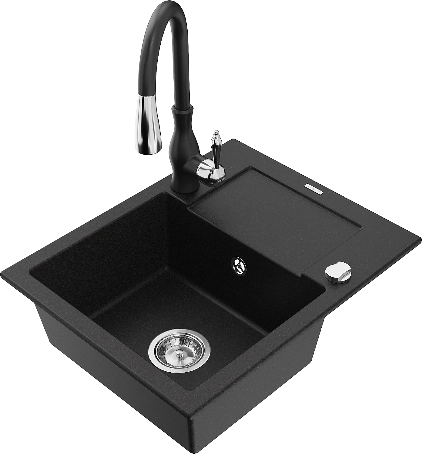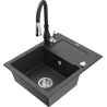 Mexen Enzo granit izlietne ar vienu nodalījumu, drenāžu un virtuves krānu Savita, melna - 6506-77-672601-70