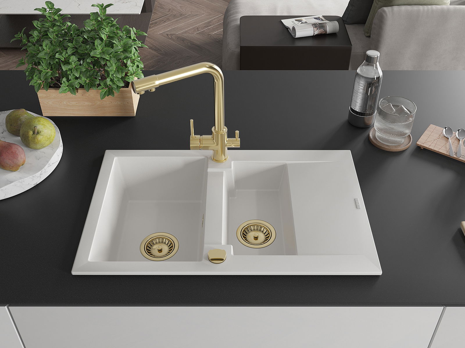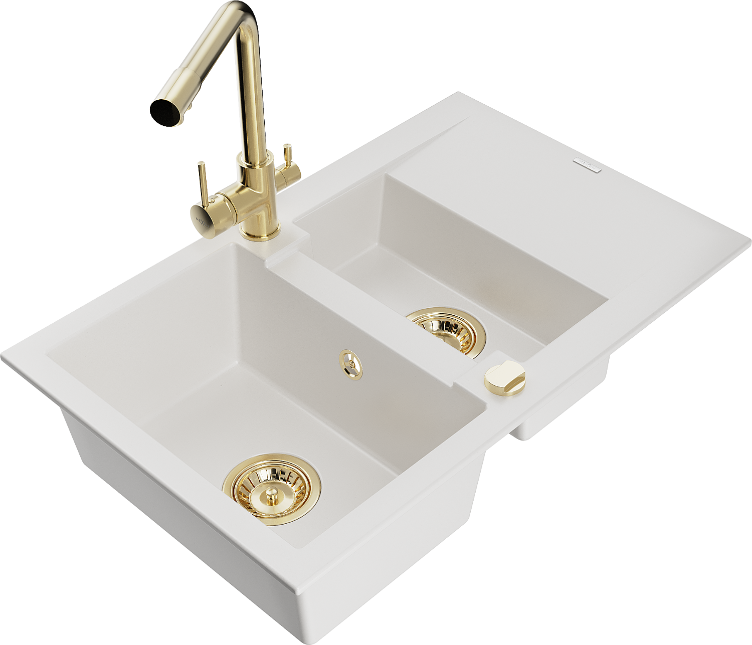 Mexen Gaspar granitēta izlietne ar 1,5 nodalījumu, noteka un virtuves jaucējkrānu Duero, balta - 6507-20-671600-50