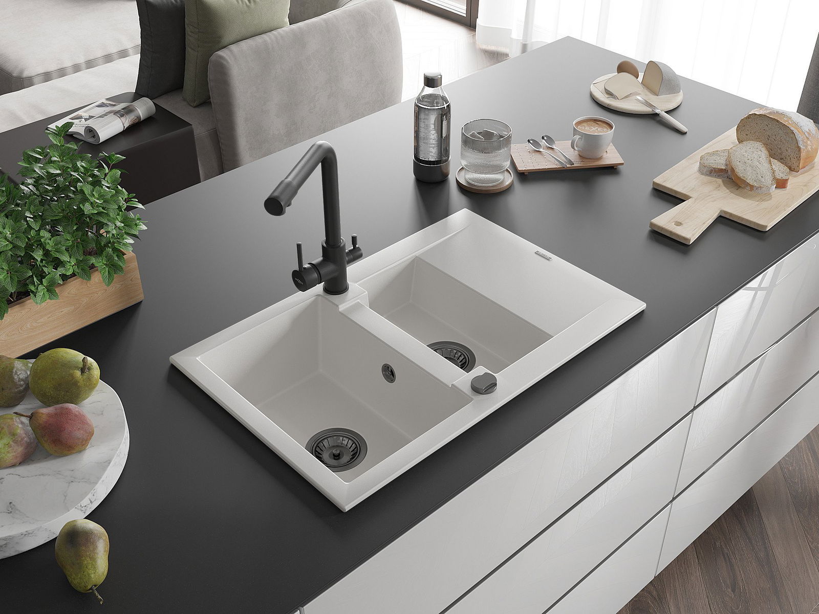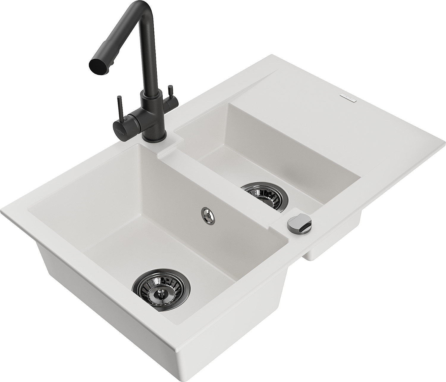 Mexen Gaspar 1,5 nodalēmju granīta izlietne ar noteces un virtuves jaucējkrānu Duero, balta - 6507-20-671600-70