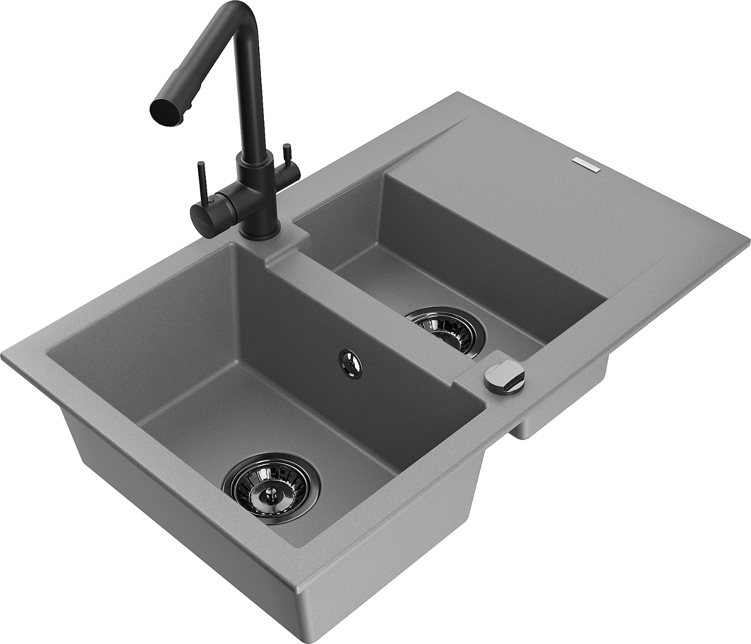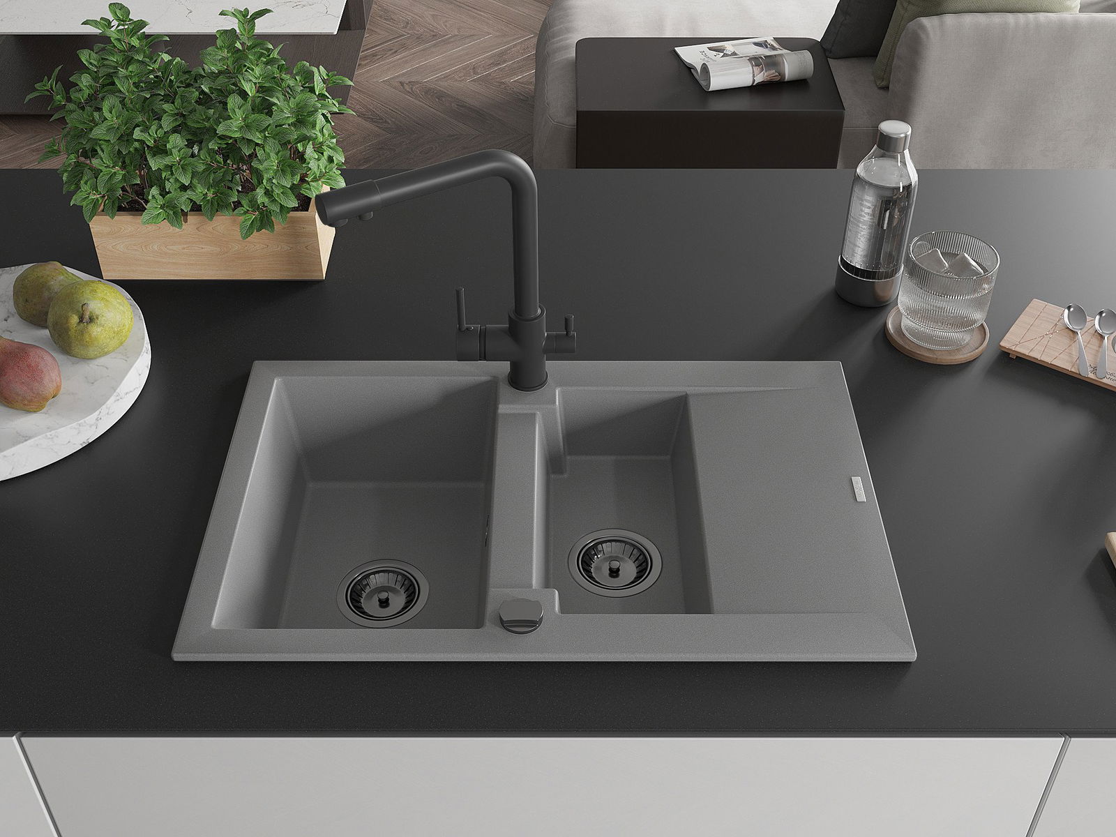 Mexen Gaspar granīta izlietne ar 1,5 nodalījumiem, noteces vietu un virtuves jaucējkrānu Duero, pelēks - 6507-71-671600-70-B