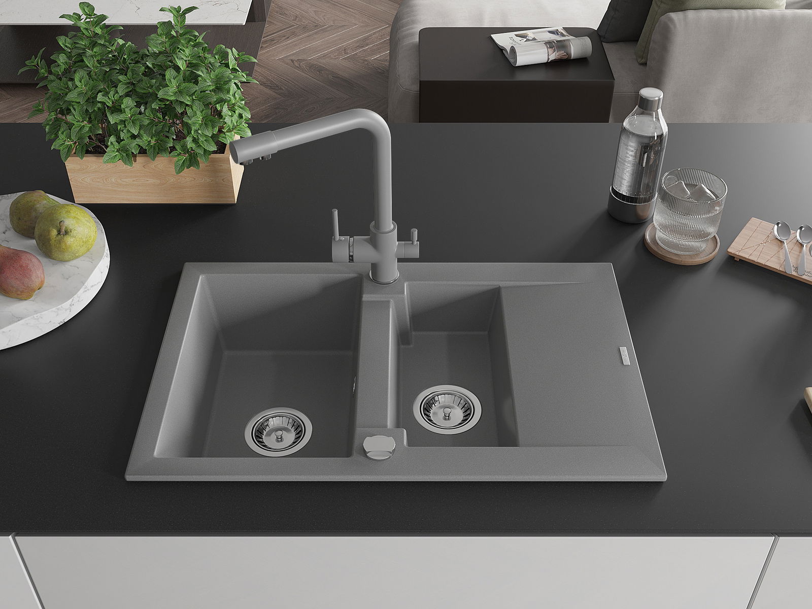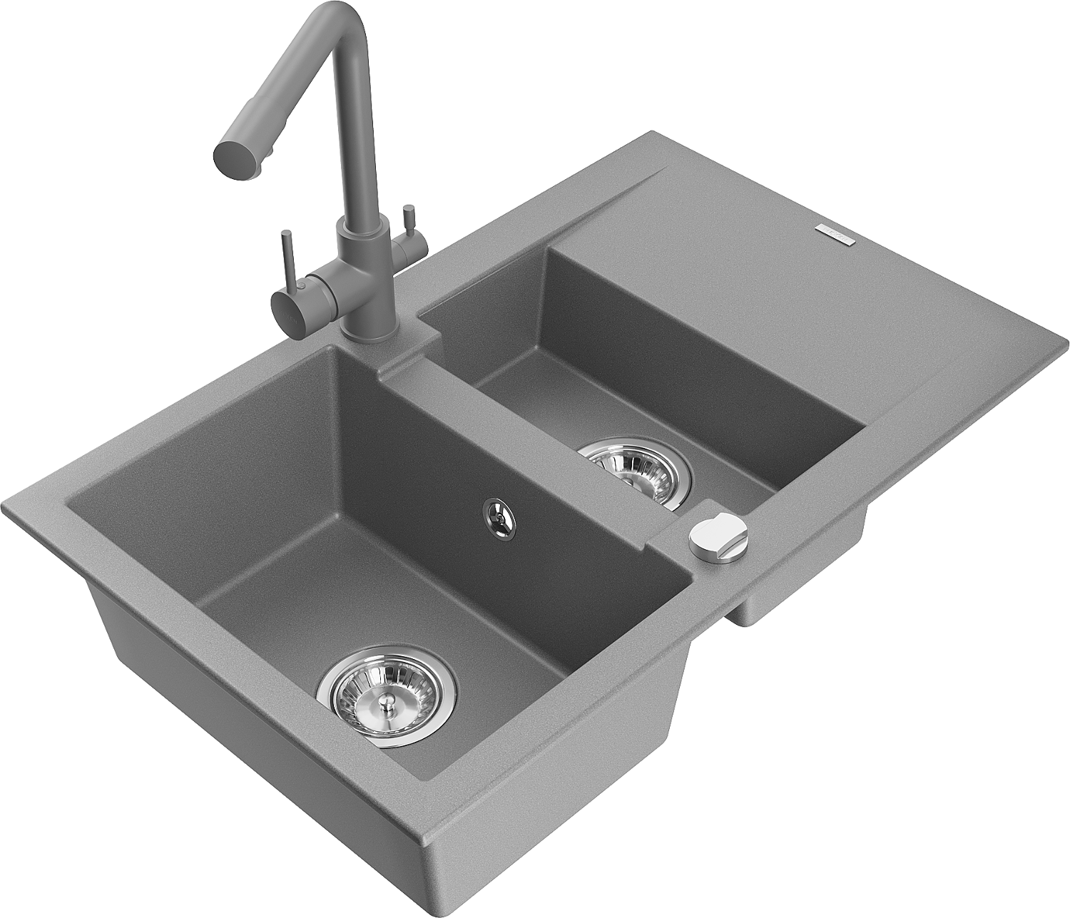Mexen Gaspar Granitā izlietne ar 1,5 nodalījumiem, noteces sekciju un Duero virtuves jaucējkrānu, pelēka - 6507-71-671600-71