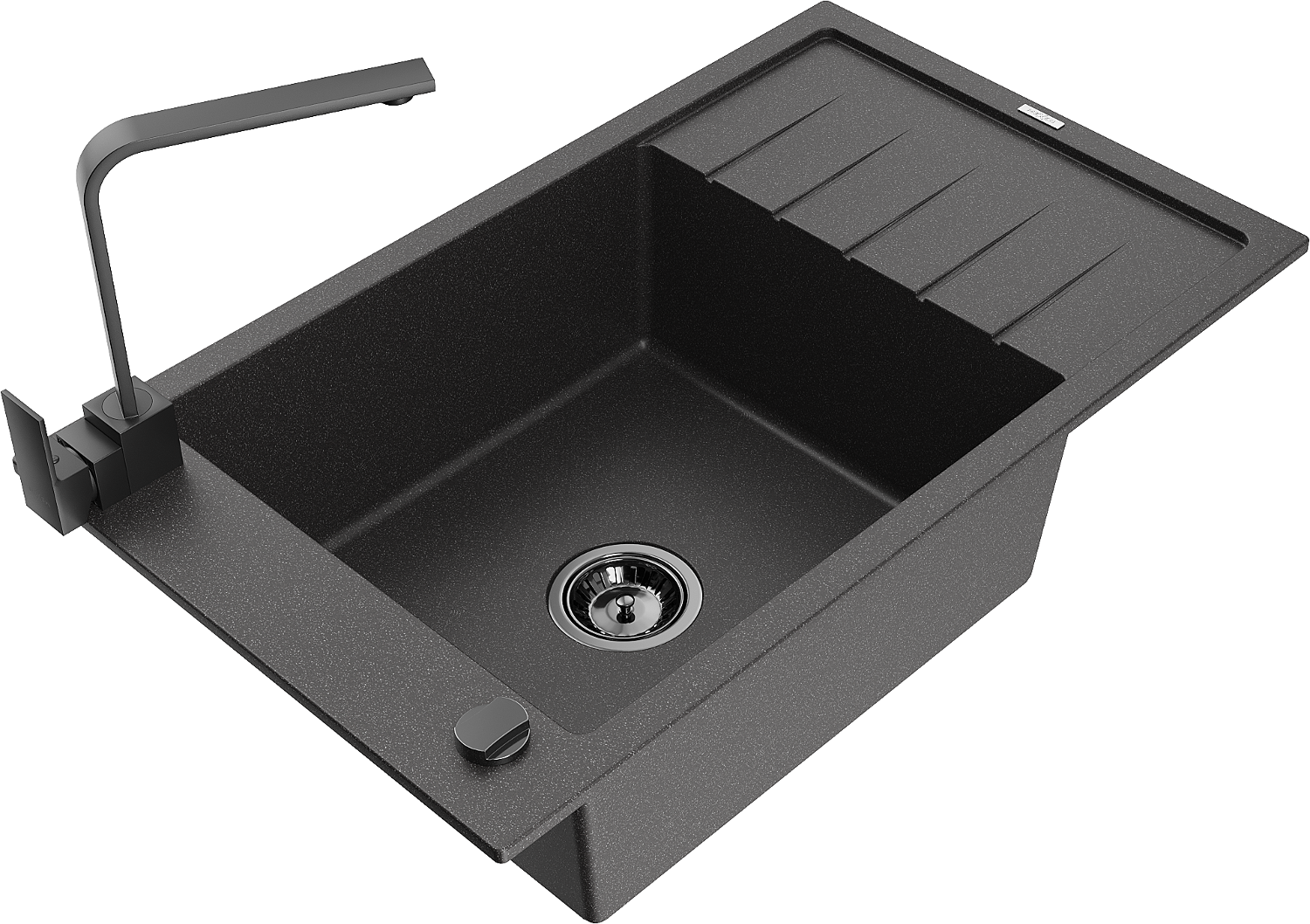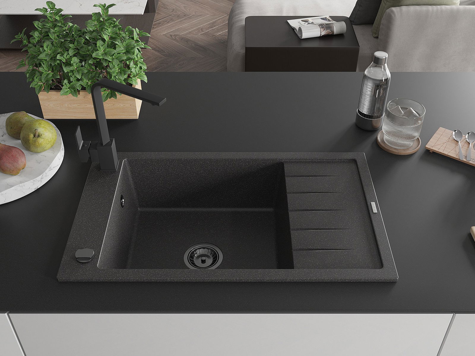 Mexen Elias granīta izlietne ar vienu nodalījumu, notekpaplāti un virtuve jaucējkrānu Rita, melna ar punktiem