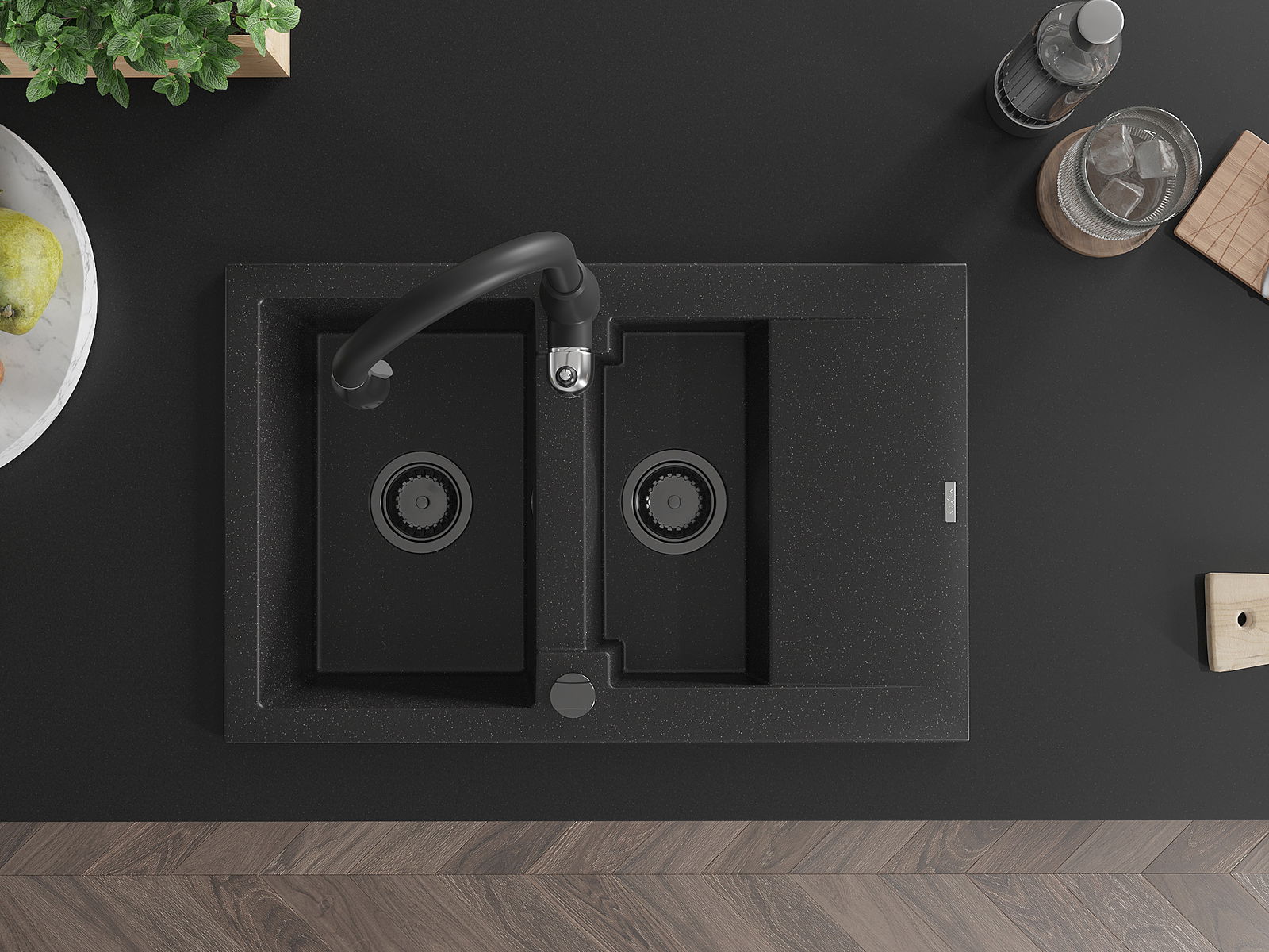Mexen Gaspar granitizlietne ar 1,5 nodalījumu ar notekas un virtuves jaucējkrānu Savita, melns/sudrabs - 6507-73-672601-70-B