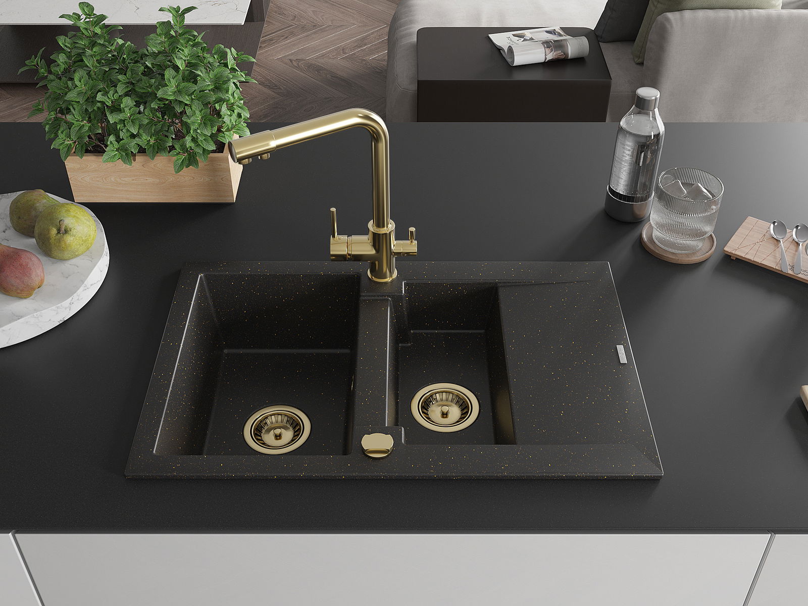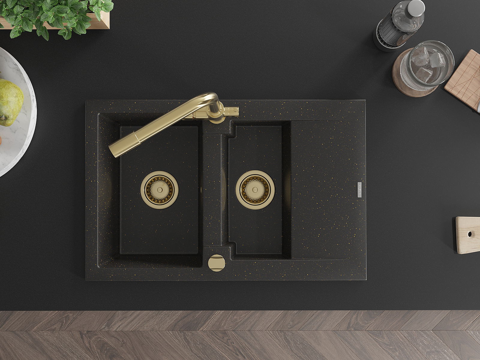 Mexen Gaspar granitizlietne 1,5 nodalījumu ar noteces virsmu un virtuves jaucējkrānu Duero, melns/zelta metāliskais