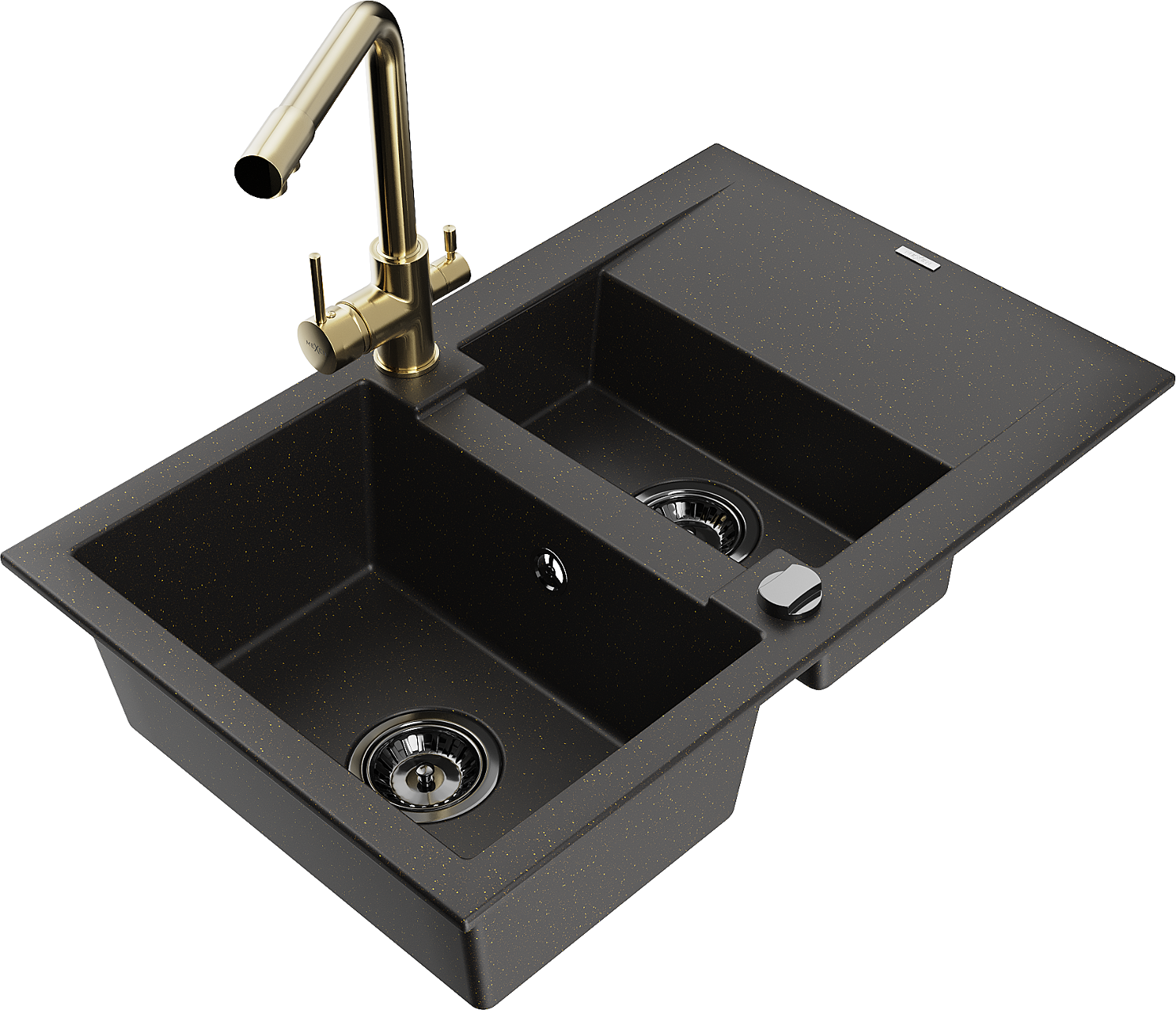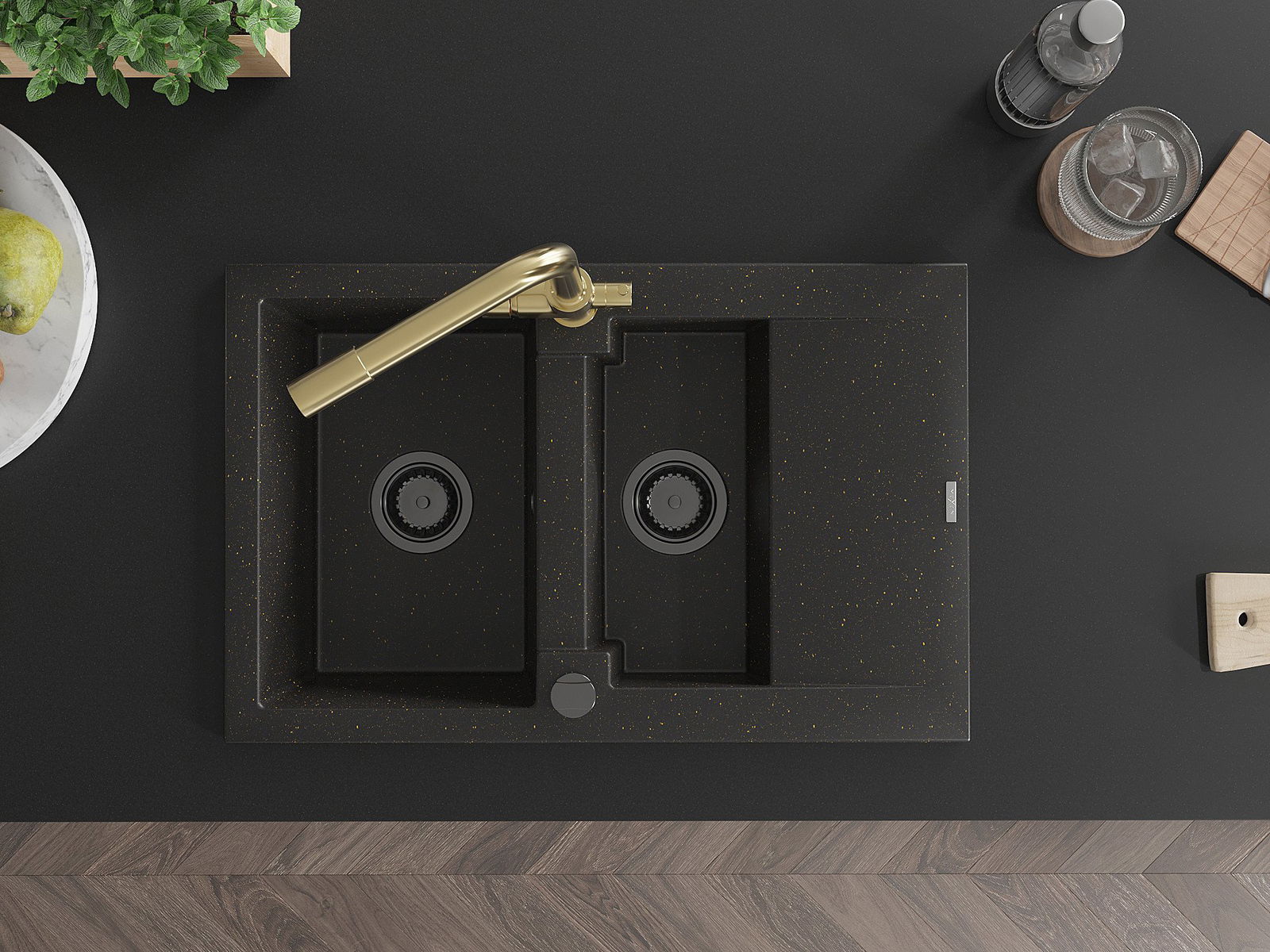 Mexen Gaspar granitā izlietne ar 1,5 nodalījumu, noteces un virtuves jaucēju Duero, melna/zeltaina - 6507-75-671600-50-B