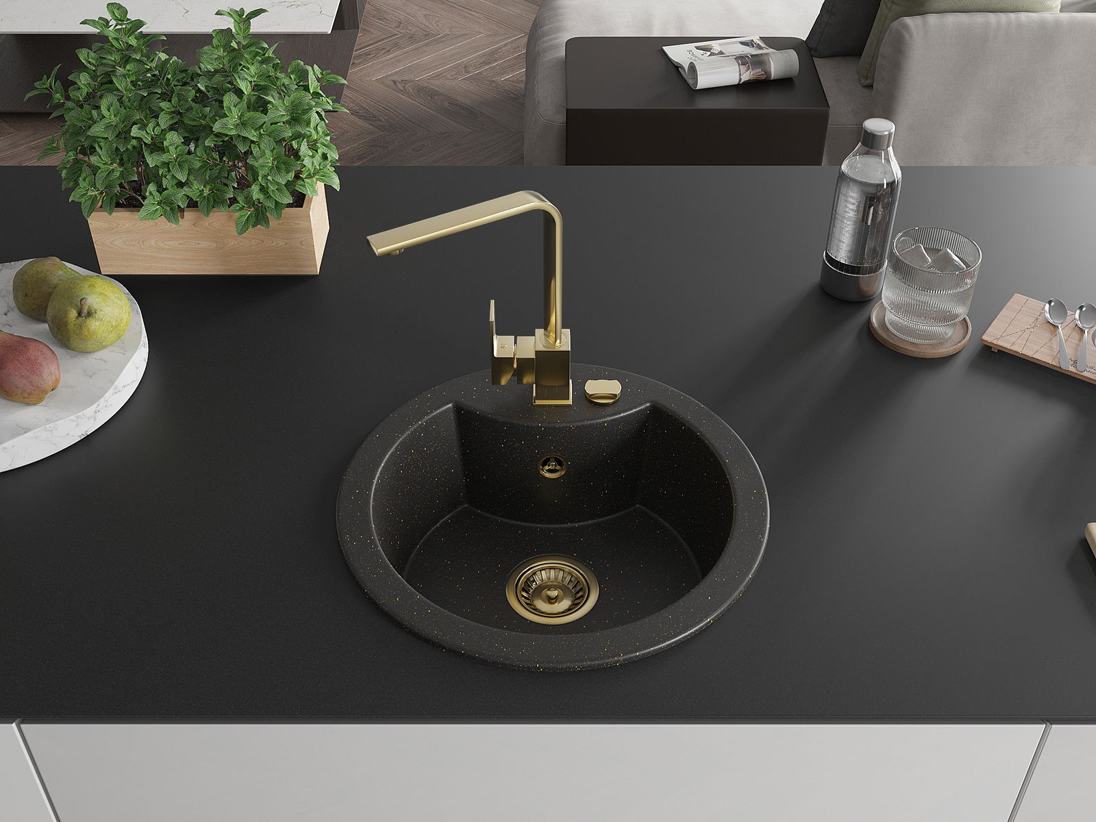 Mexen Diego Granitē izlietne ar 1 nodalījumu un virtuves jaucējkrānu Rita, melns/zeltīts - 6512-75-670300-50