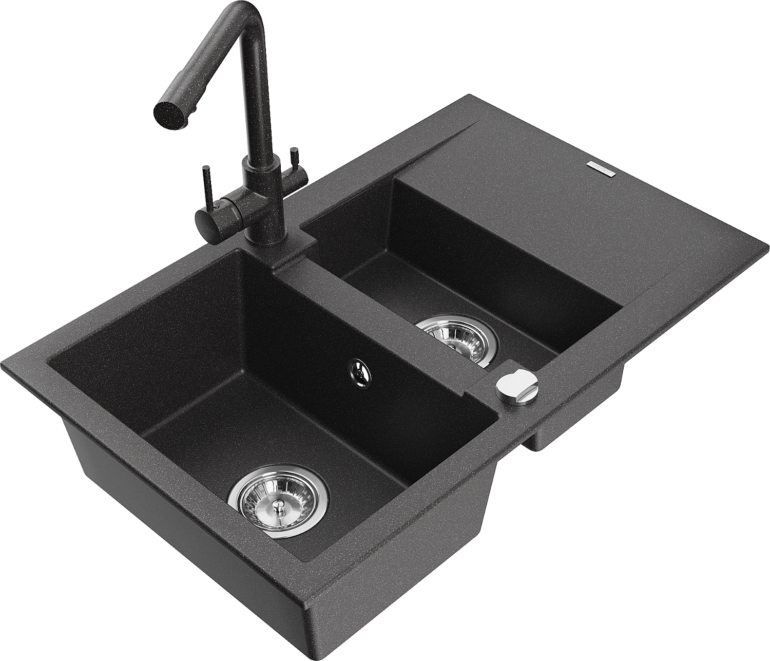 Mexen Gaspar granitē izlietne ar 1,5 nodalījumiem, noteces vietu un virtuves jaucējkrānu Duero, melna ar raibu rakstu