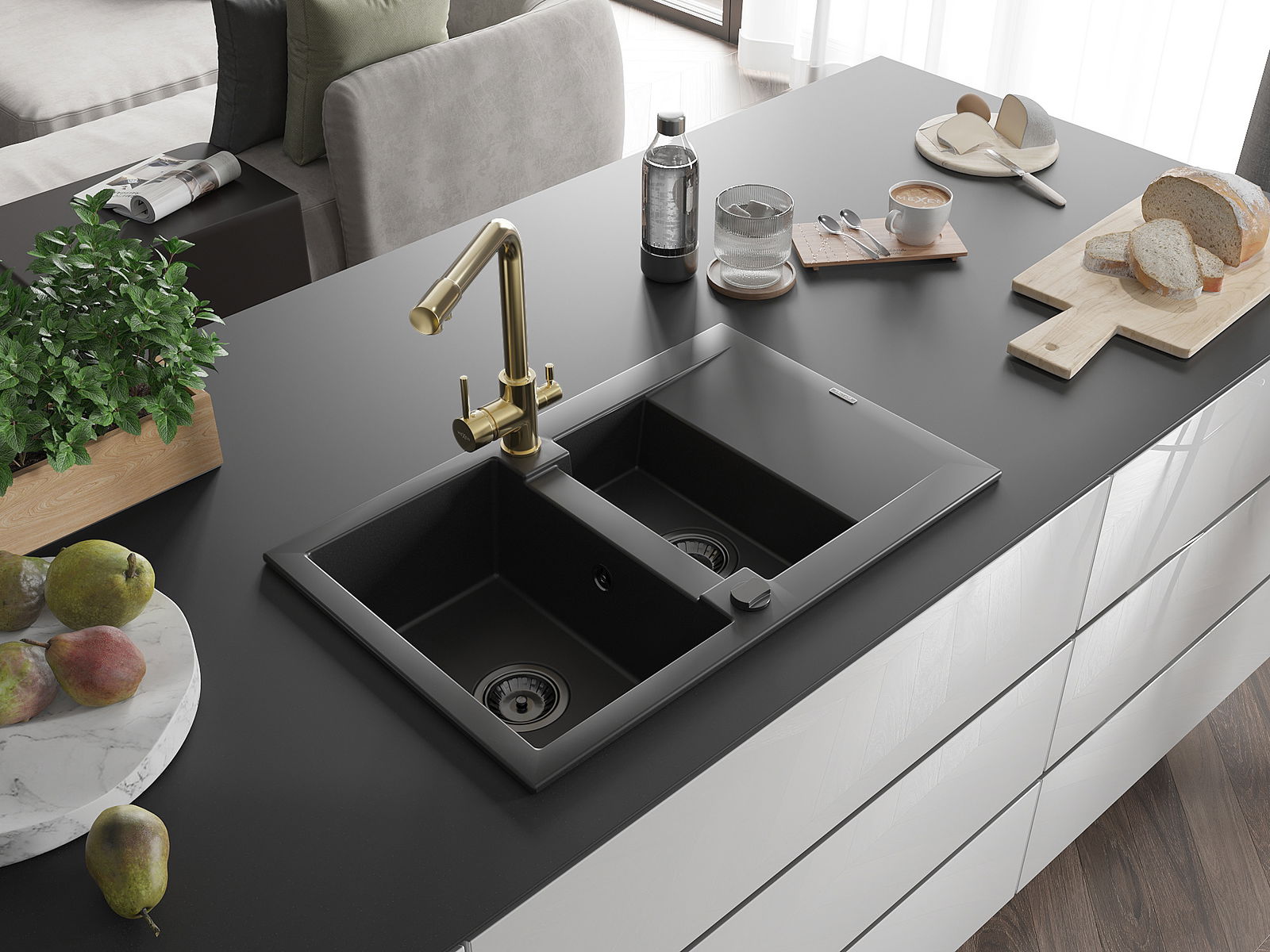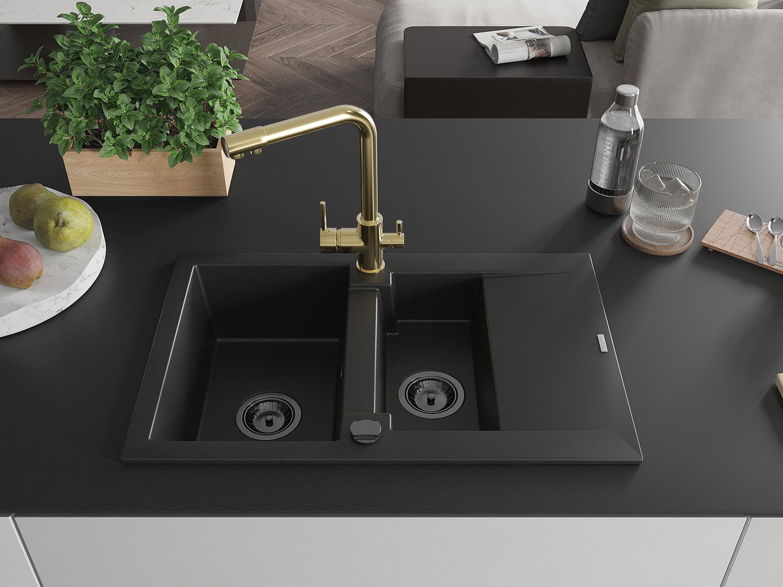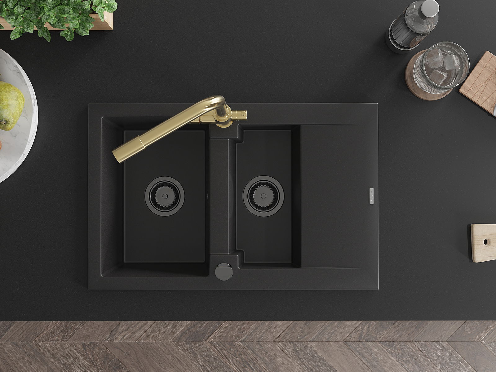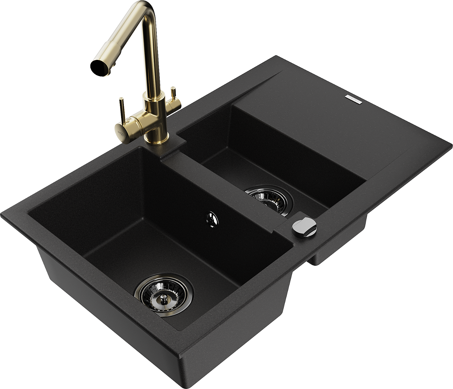 Mexen Gaspar granīta izlietne 1,5 nodalījumu ar noteces virsmu un virtuves jaucējkrānu Duero, melna - 6507-77-671600-50-B