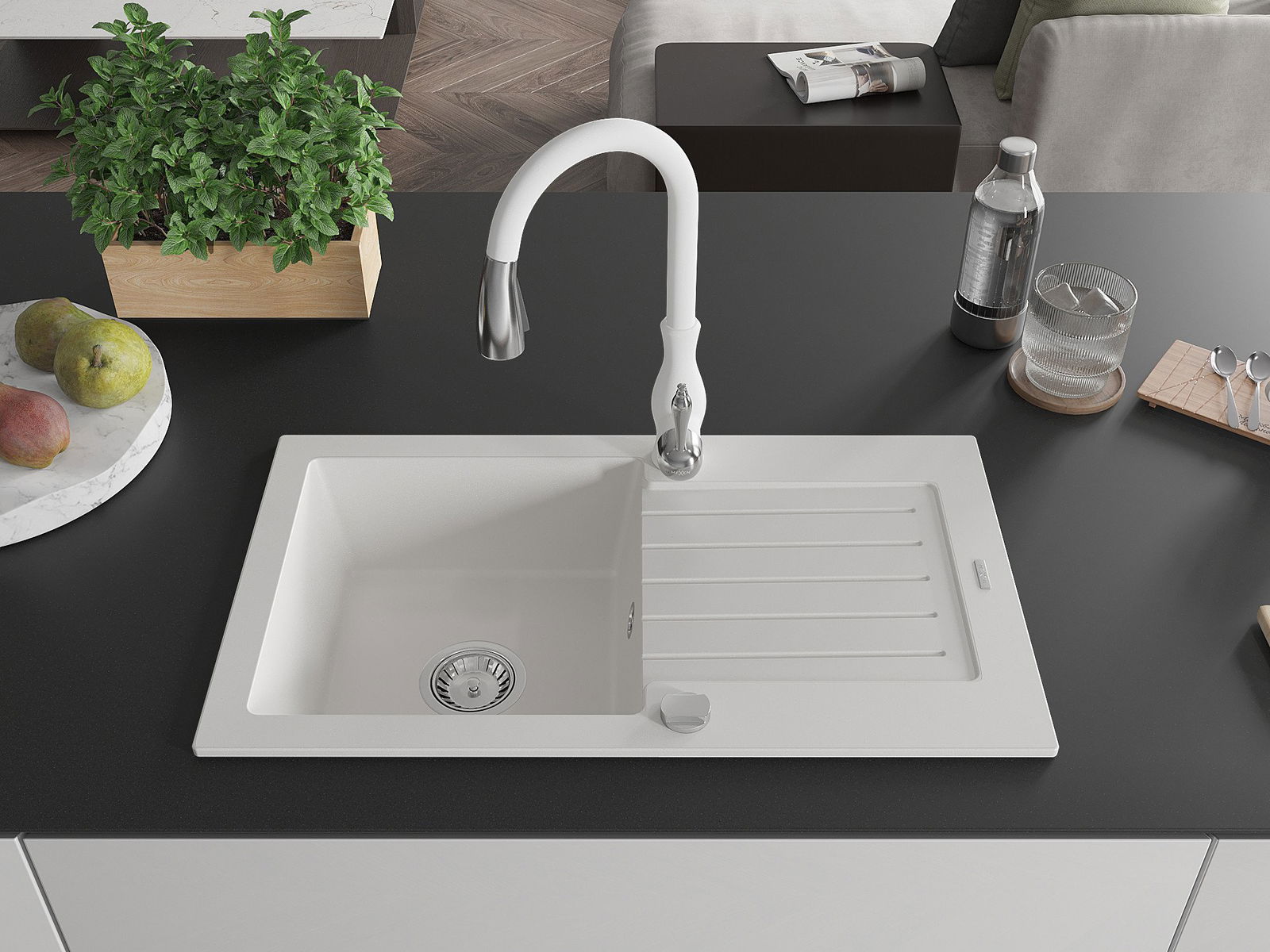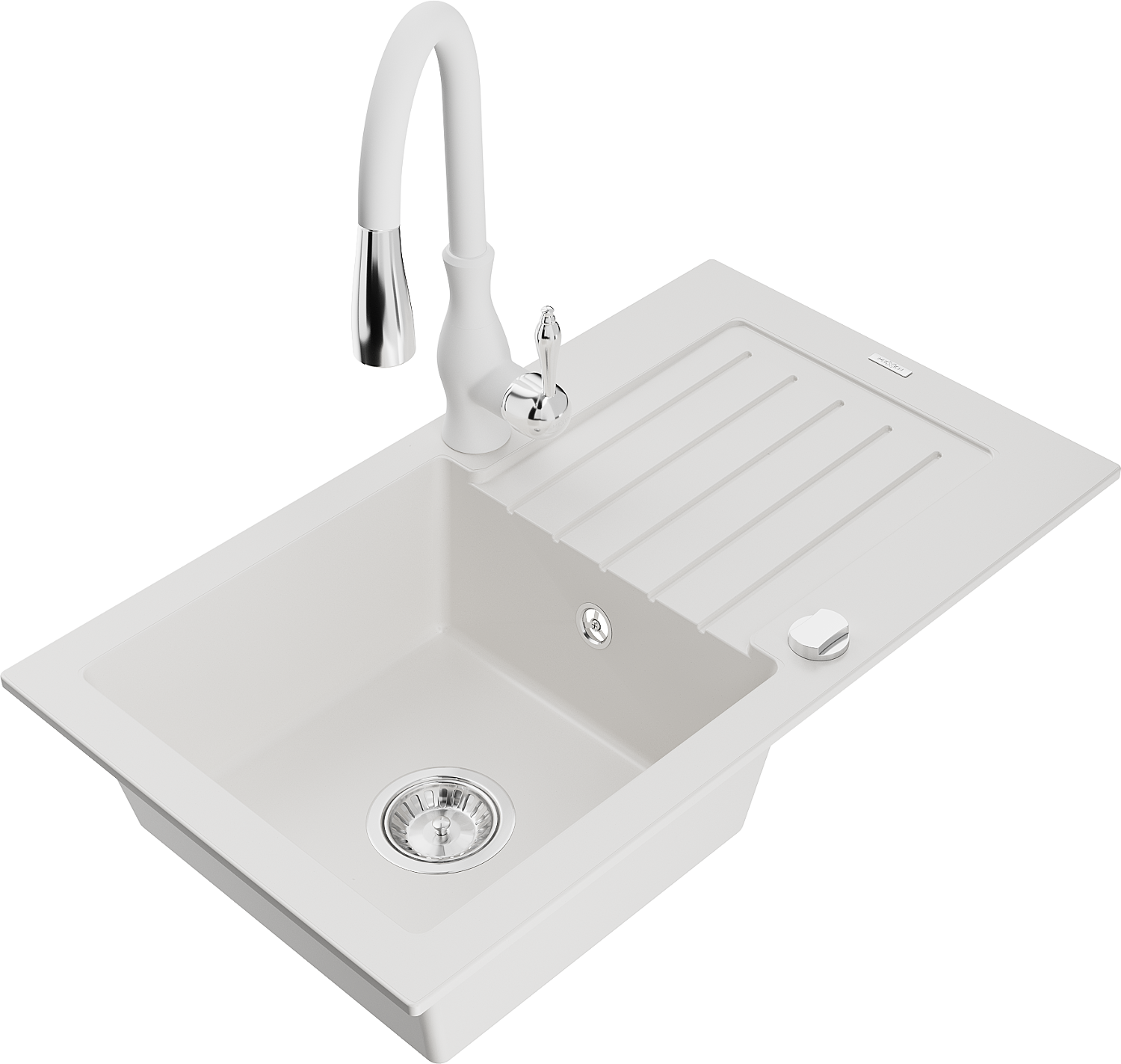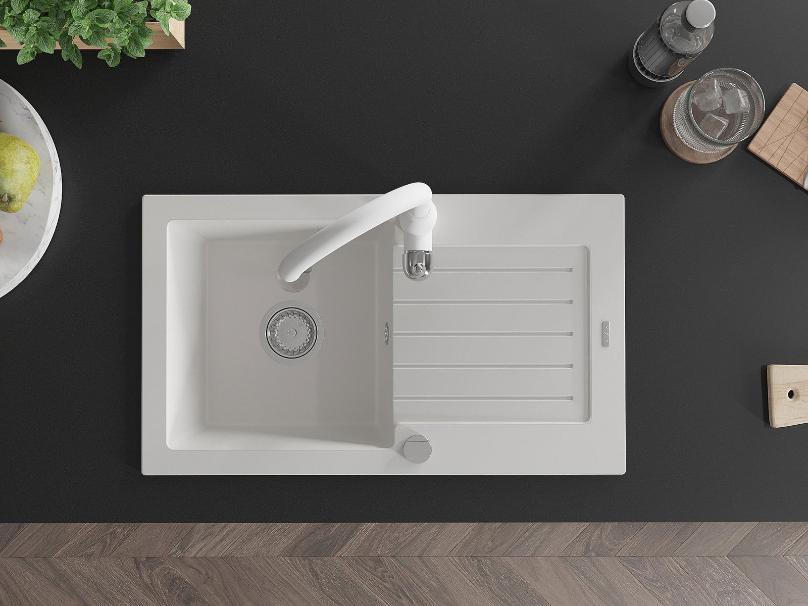 Mexen Pablo granitēta vienkameras izlietne ar notecējumu un virtuves jaucējkrānu Savita, balta - 6510-20-672601-20