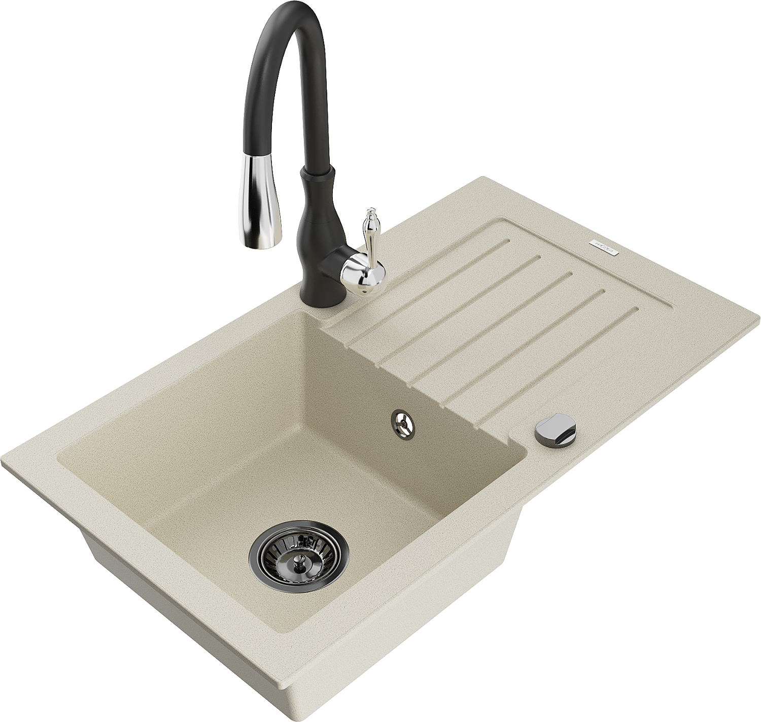 Mexen Pablo granīta izlietne ar vienu nodalījumu, veļas trauku un virtuves jaucējkrānu Savita, bēša - 6510-69-672601-70