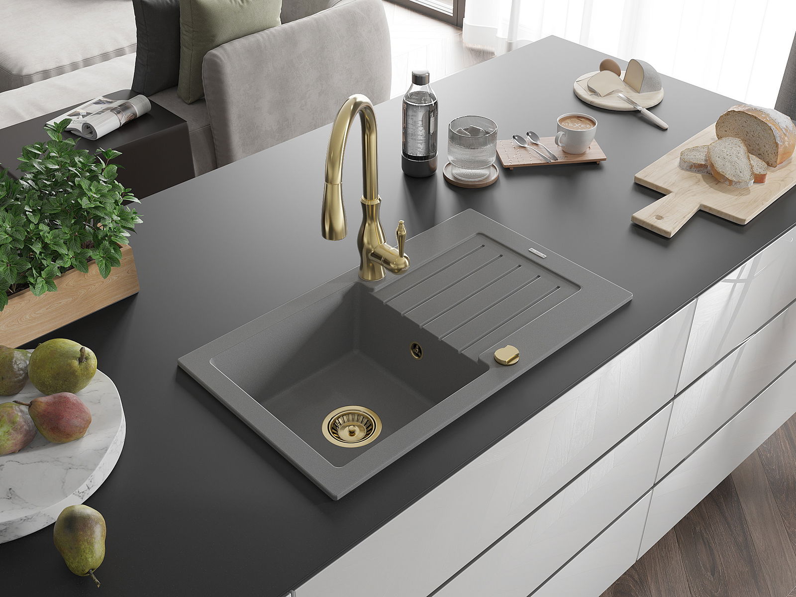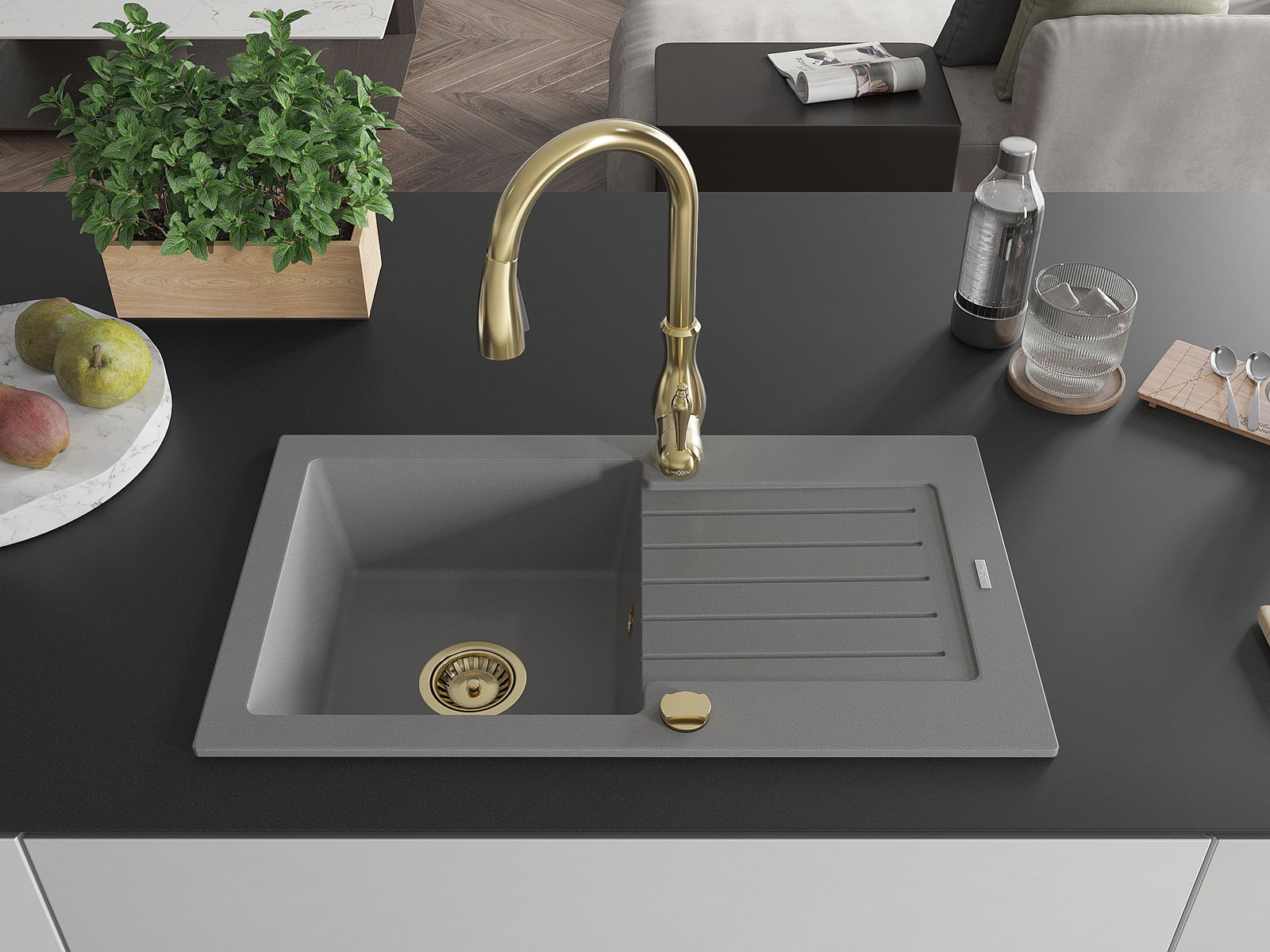 Mexen Pablo granīta virtuves izlietne ar vienu nodalījumu un noteces spaini un virtuves krānu Savita, pelēka - 6510-71-672601-50