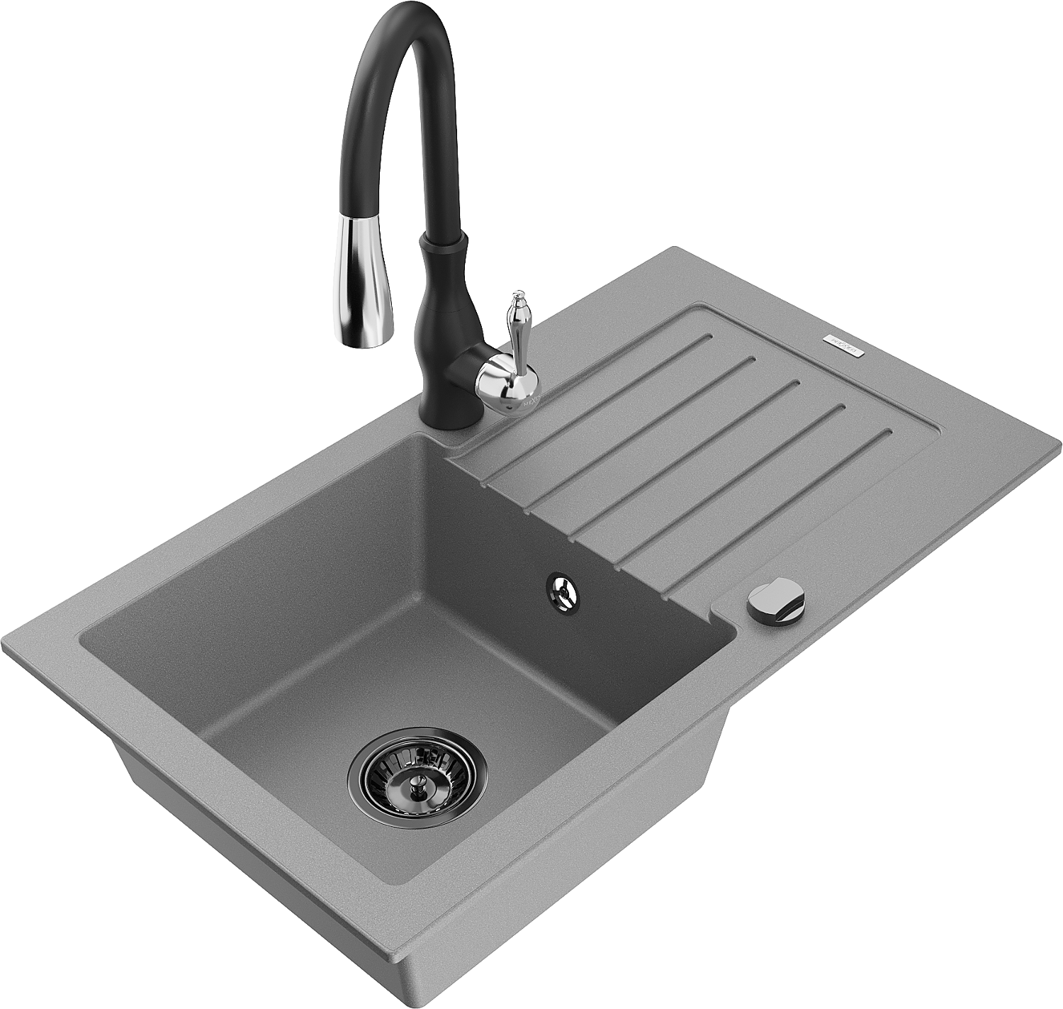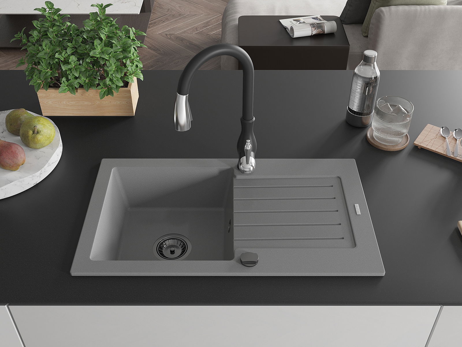 Mexen Pablo granīta virtuves izlietne ar vienu nodalījumu, noteku un izlietnes jaucējkrānu Savita, pelēka - 6510-71-672601-70-B