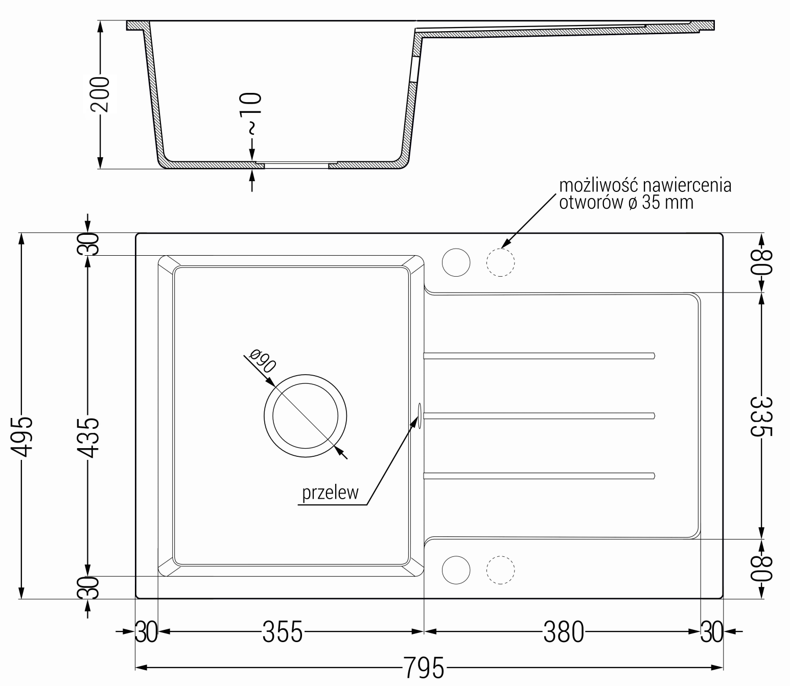 Izlietnei ir 2 daļēji izurbtas atveres ar diametru 35 mm, kuras var pašrocīgi izsist. Tās var izmantot, piemēram, šķidruma dozatora uzstādīšanai, kas novērsīs plastmasas pudeļu klātbūtni virtuvē un piešķirs tai elegantu apdari.
