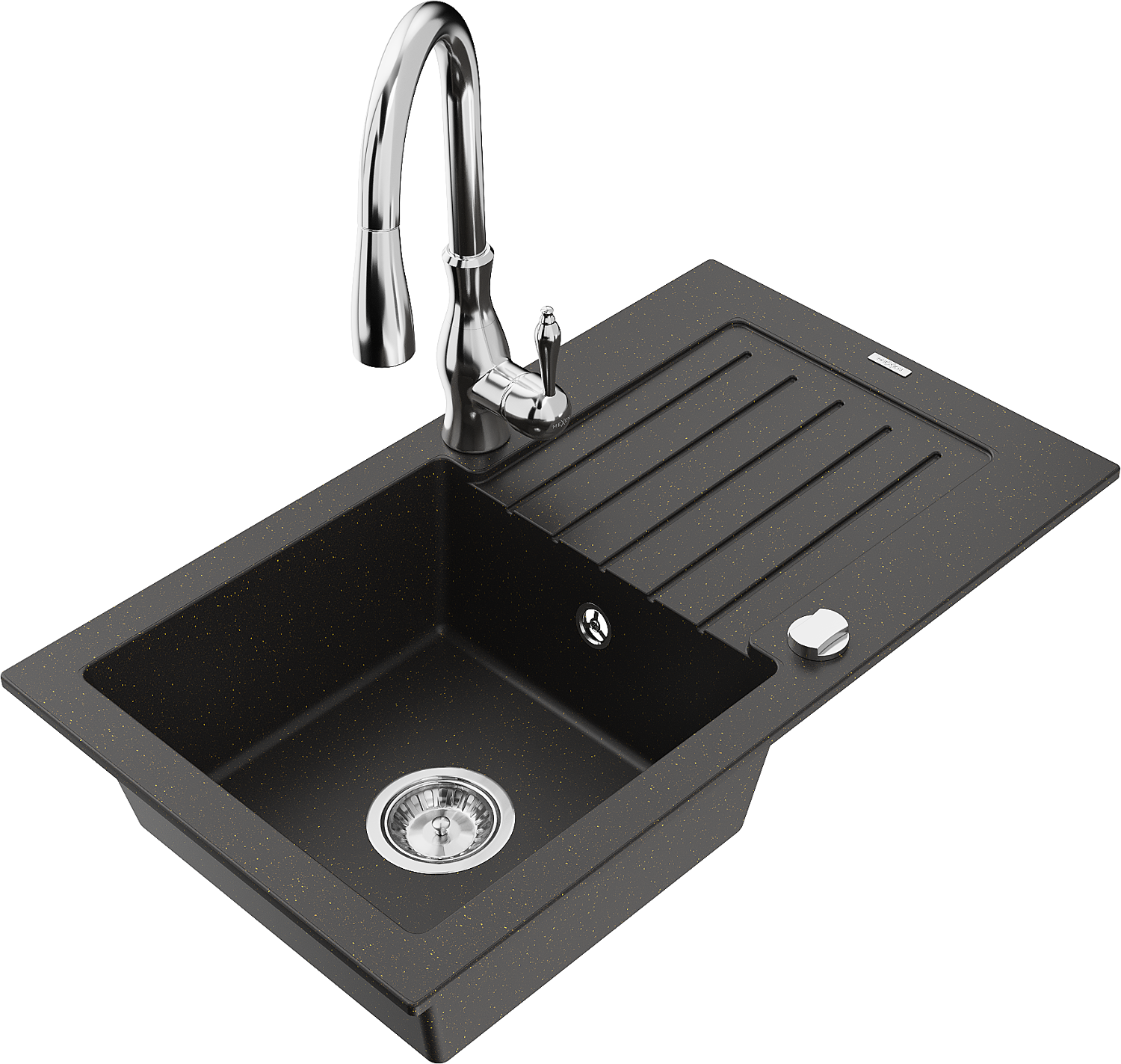 Mexen Pablo Granitizlietne 1-kameras ar noteci un virtuves jaucējkrānu Savita, melns/zeltains metālisks - 6510-75-672601-00