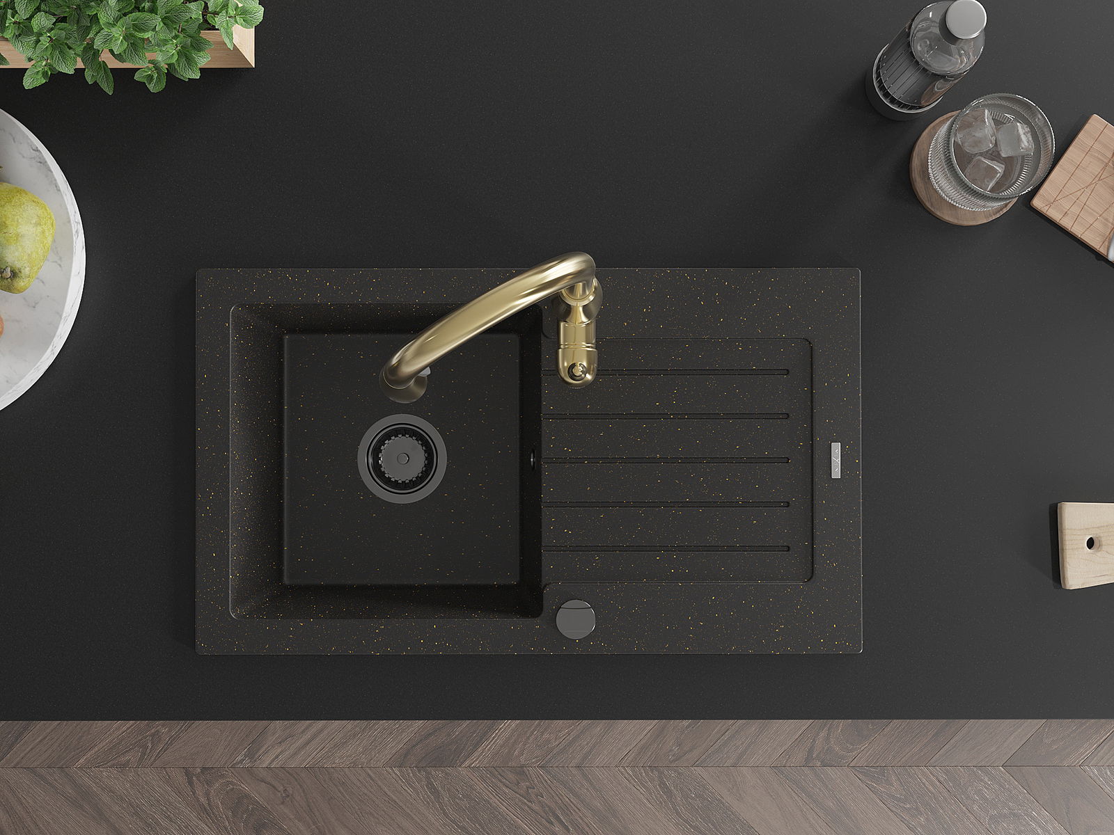 Mexen Pablo granīta izlietne ar 1 nodalījumu, ar noteces vietu un virtuves maisītāju Savita, melns/zeltains metāliks