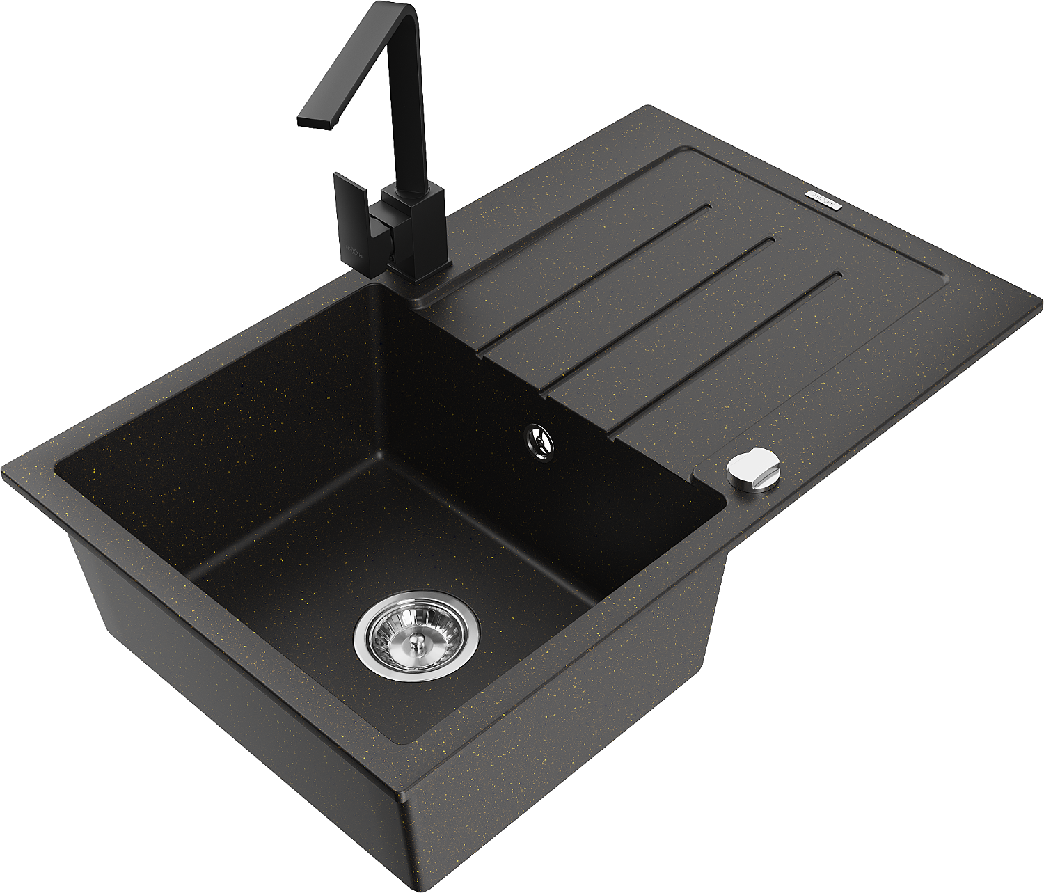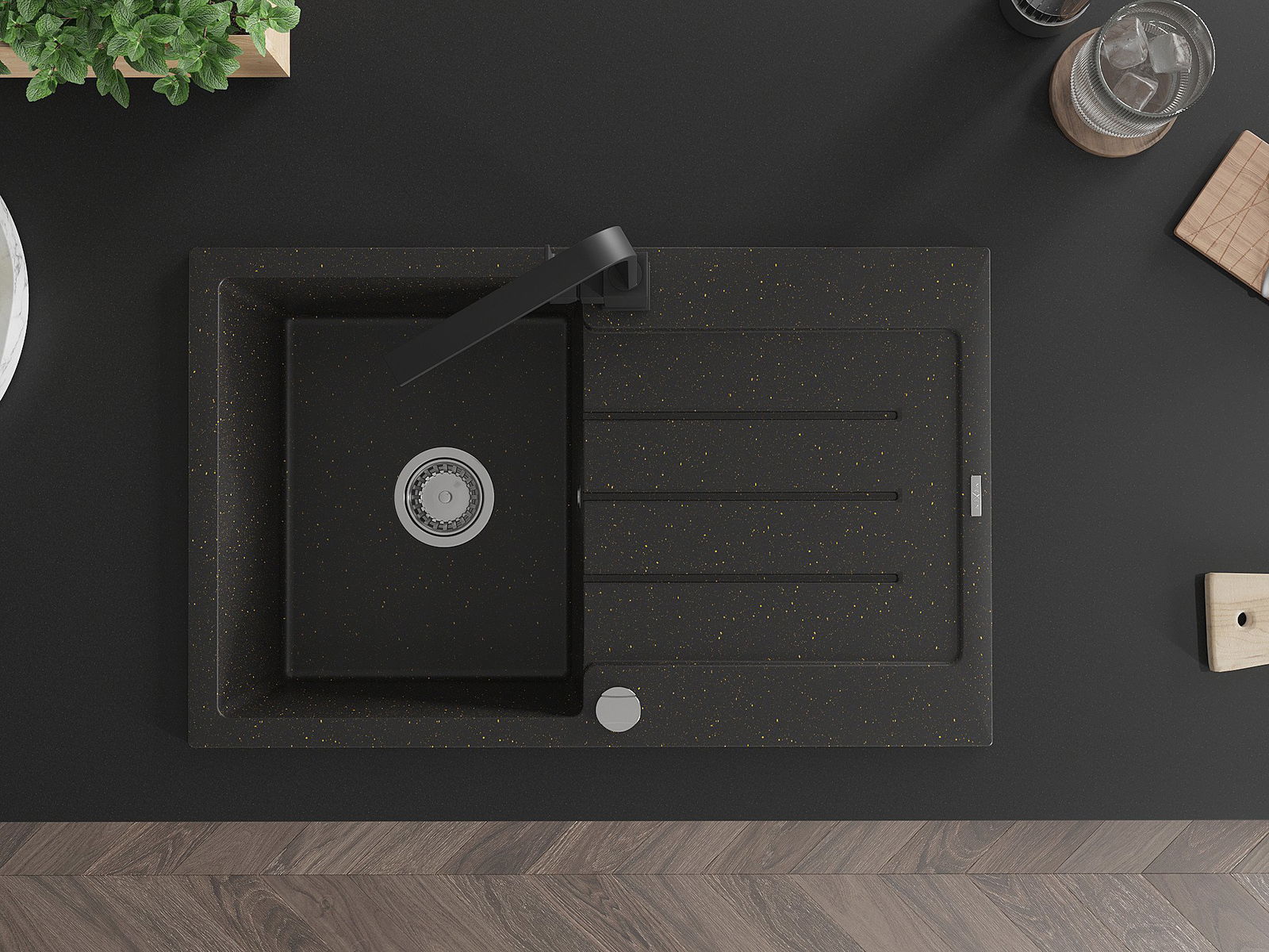 Mexen Bruno granitizlietne izlietne ar vienu nodalījumu un noteces virsmu, ar virtuves jaucējkrānu Rita, melna/zeltīta