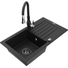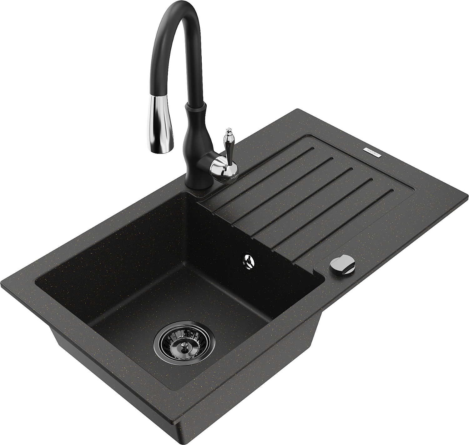 Mexen Pablo granitizlietne ar vienu kameru ar noteces virsmu un virtuves krānu Savita, melns/zeltains metālisks