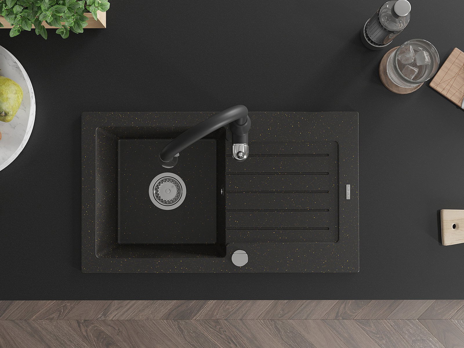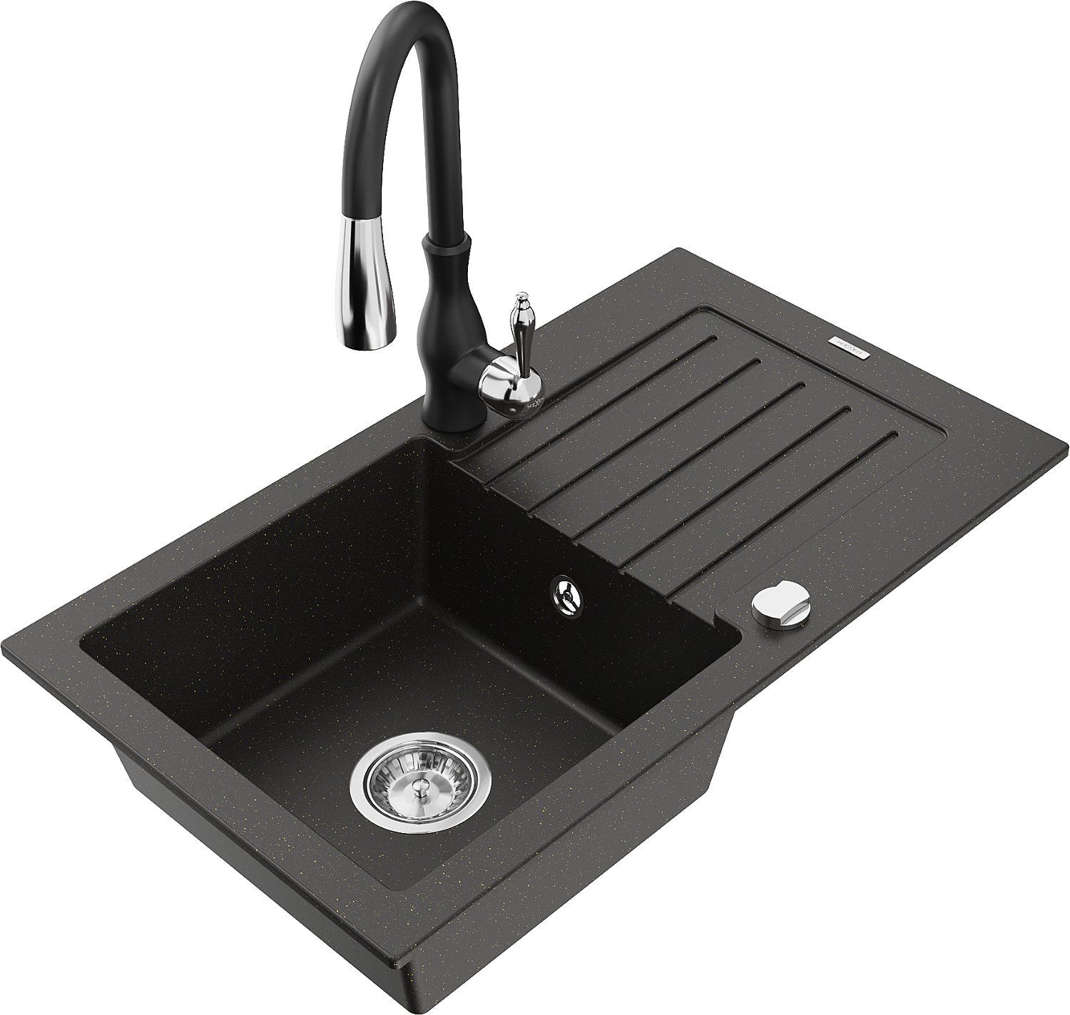 Mexen Pablo granitizlietne ar vienu nodalījumu ar noteku un virtuves jaucējkrānu Savita, melna/zeltīta metālika