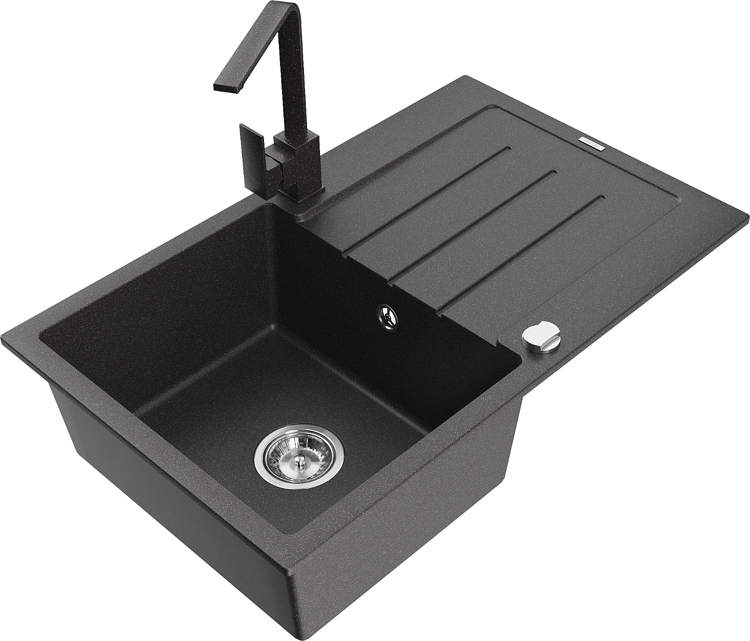 Mexen Bruno viena granīta izlietne ar noteces vietu un virtuves krānu Rita, melna ar plankumiem - 6513-76-670300-76
