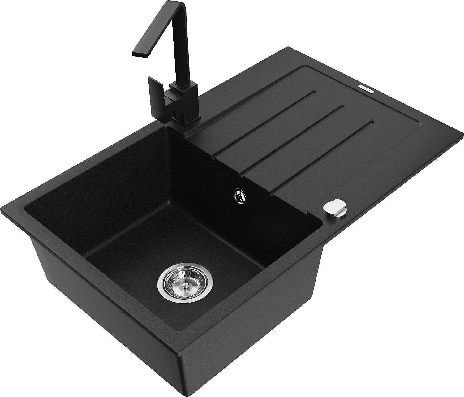 Mexen Bruno granit izlietne ar vienu nodalījumu ar noteces vietu un virtuves jaucējkrānu Rita, melna - 6513-77-670300-70