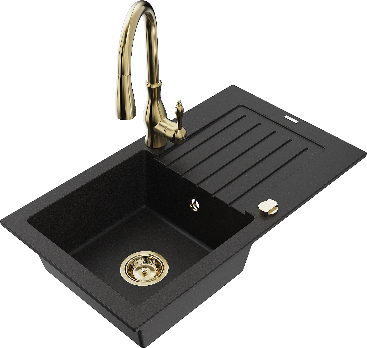 Mexen Pablo granitī izlietne ar vienu nodalījumu, noteces un virtuves jaucējkrānu Savita, melna - 6510-77-672601-50