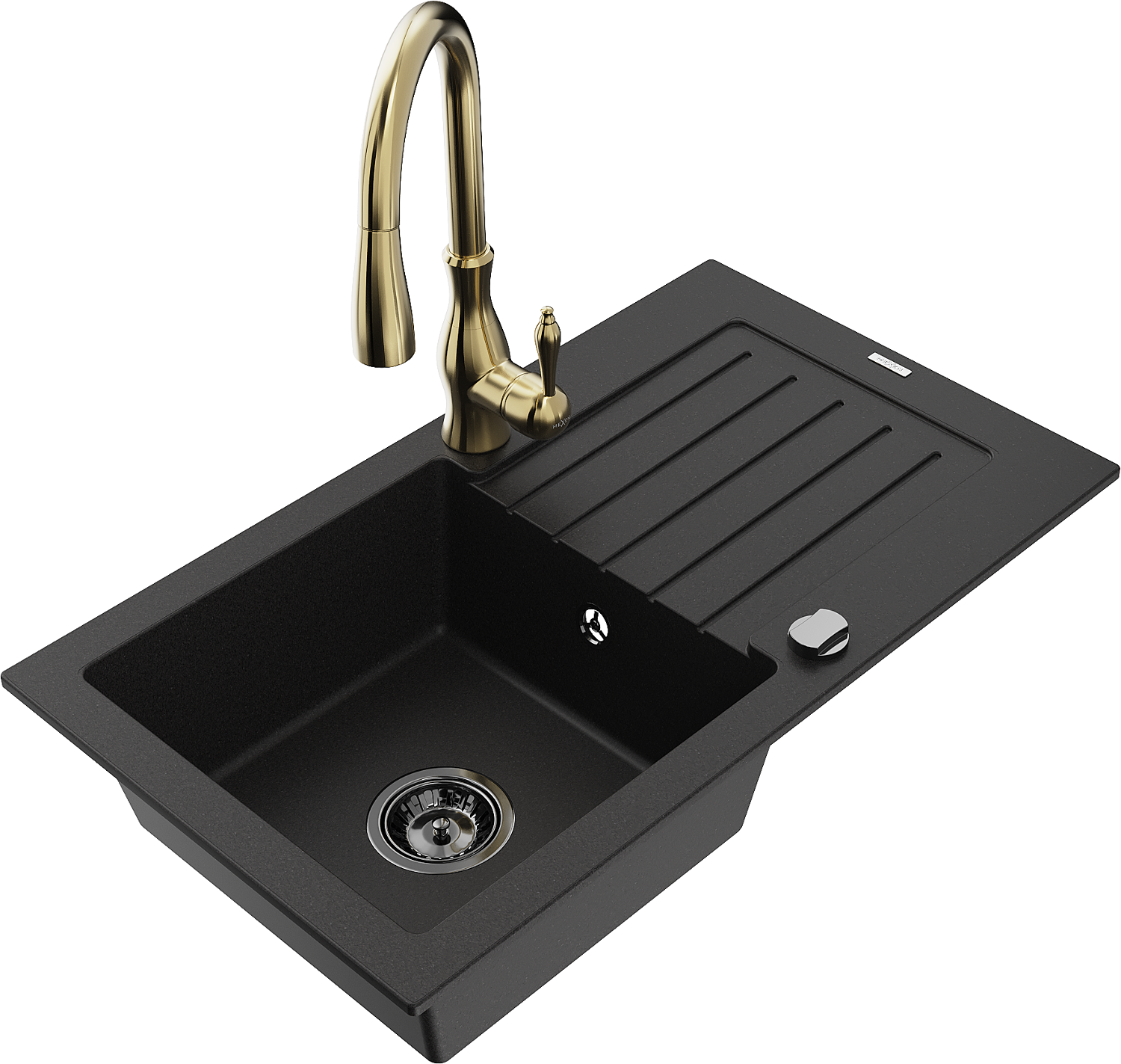 Mexen Pablo granitā izlietne ar vienu nodalījumu ar noteku un virtuves jaucējkrānu Savita, melna - 6510-77-672601-50-B