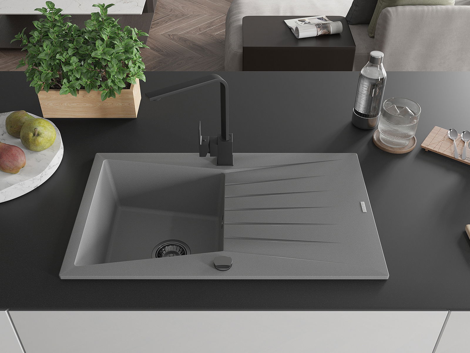 Mexen Cesar granitē izlietne ar vienu nodalījumu, noteces paneli un virtuves jaucējkrānu Rita, pelēka - 6514-71-670300-70-B