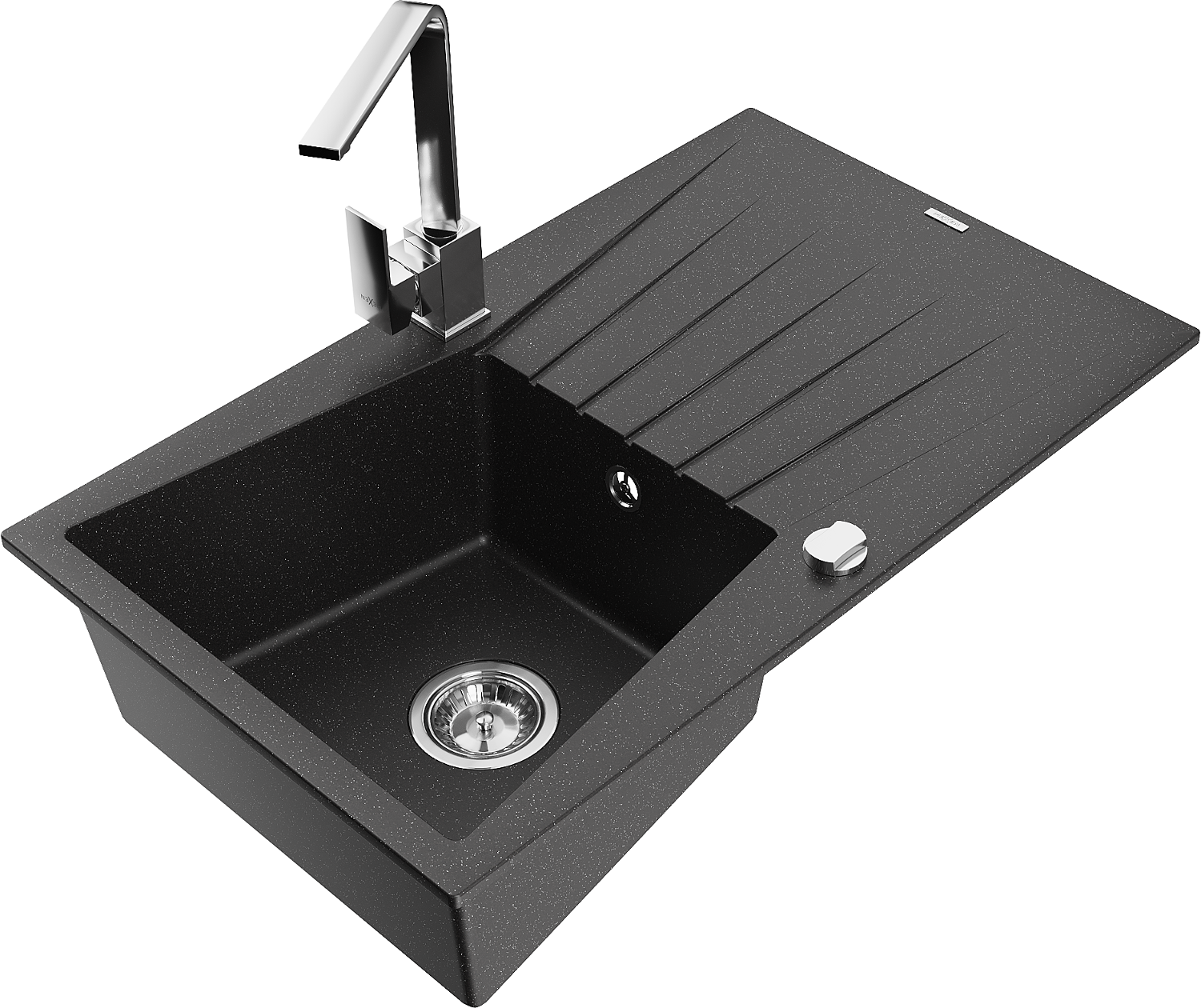 Mexen Cesar granitizlietne ar vienu kameru ar noteces paplāti un virtuves jaucējkrānu Rita, melns/sudraba metālisks