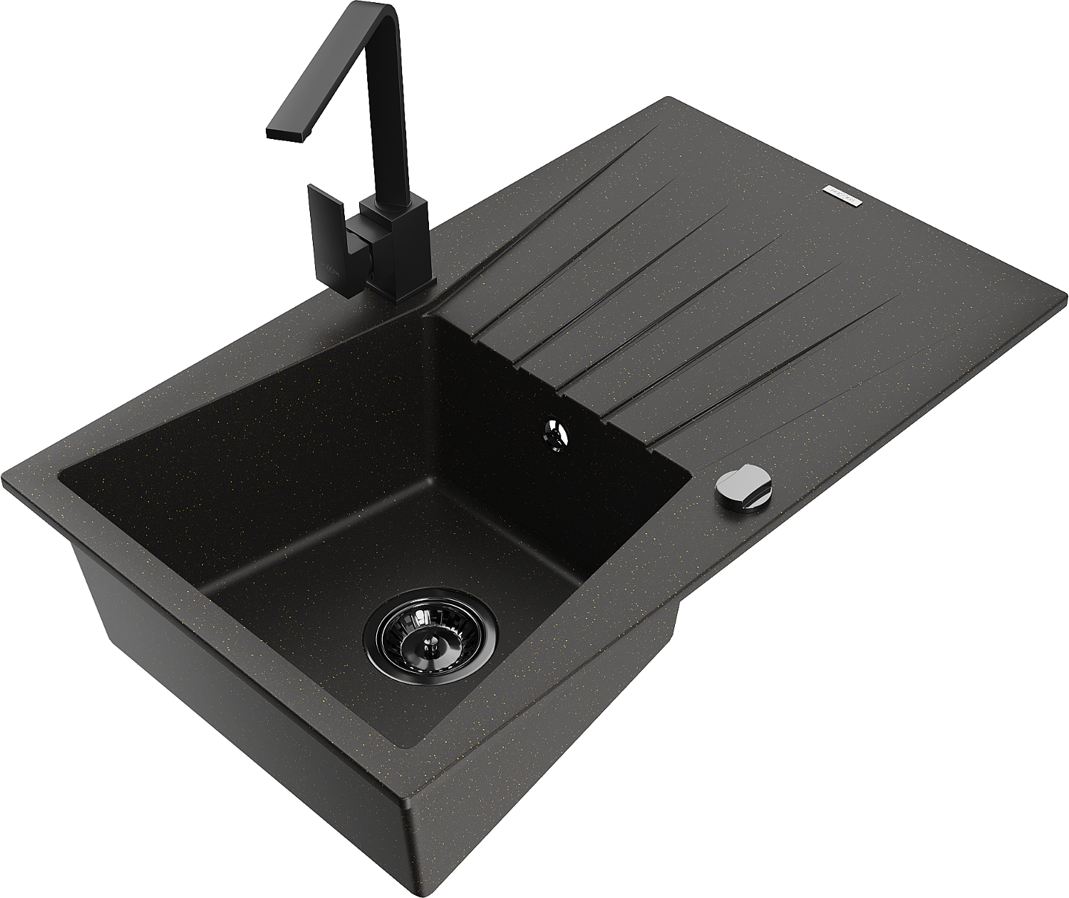 Mexen Cesar granīta izlietne ar vienu nodalījumu, noteces un virtuves krānu Rita, melna/zeltīta metālika