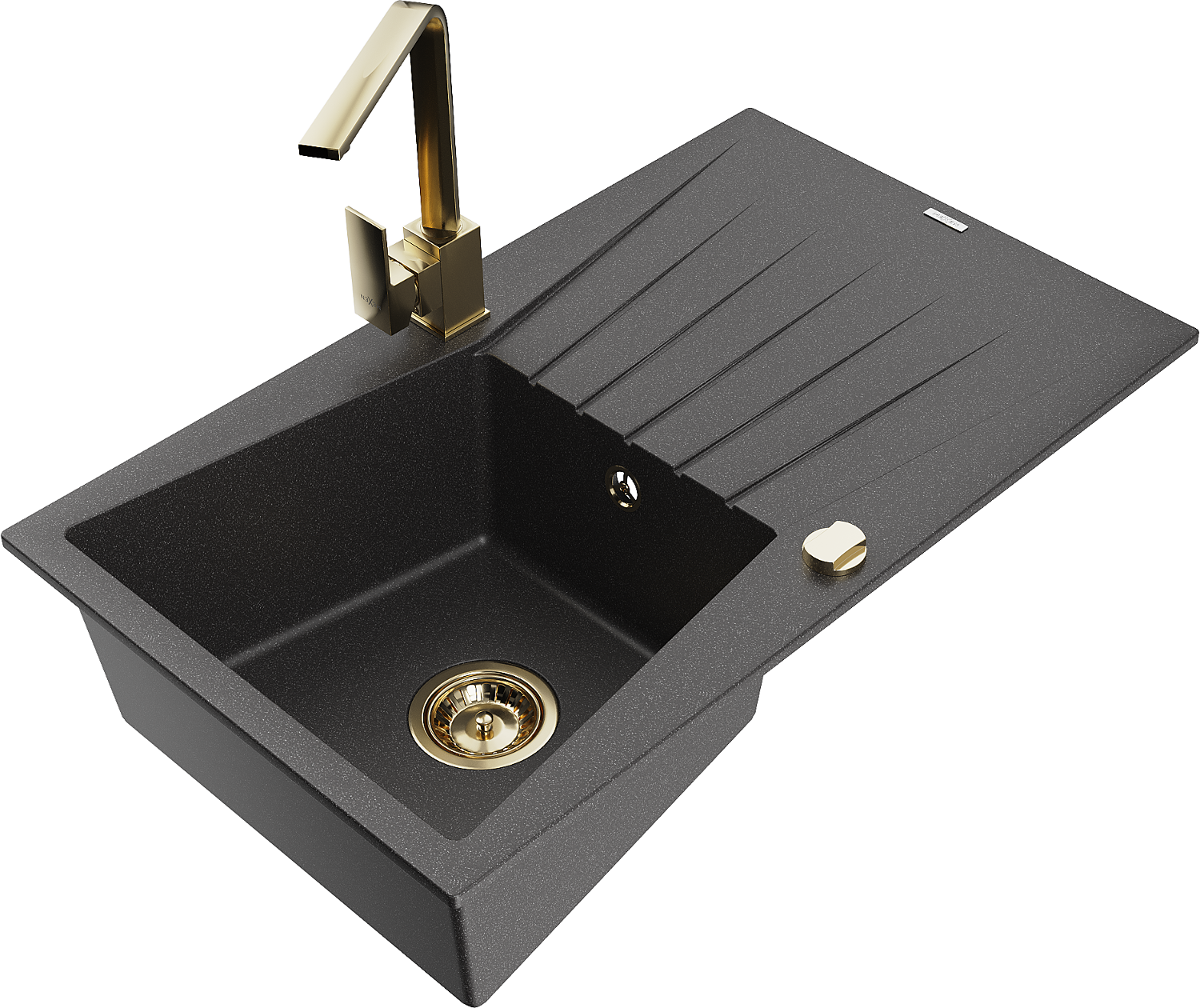 Mexen Cesar vienskamēras granīta izlietne ar noteces vietu un virtuves jaucējkrānu Rita, melna ar plankumiem