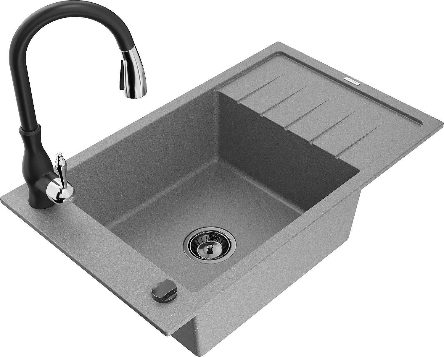 Mexen Elias granīta izlietne ar 1 nodalījumu un noteces paliktnis ar virtuves jaucējkrānu Savita, pelēka - 6511-71-672601-70-B