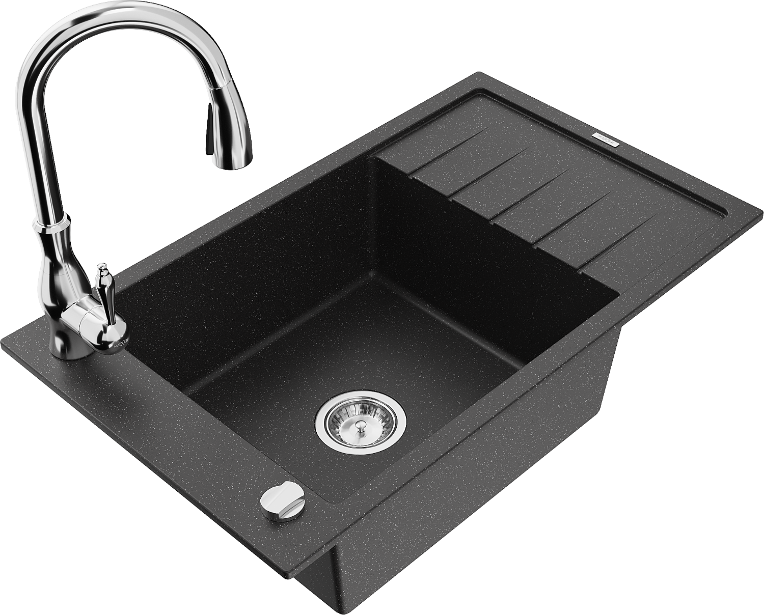 Mexen Elias 1-kameru granīta izlietne ar notecētāju un virtuves krānu Savita, melns/sudraba metālisks - 6511-73-672601-00