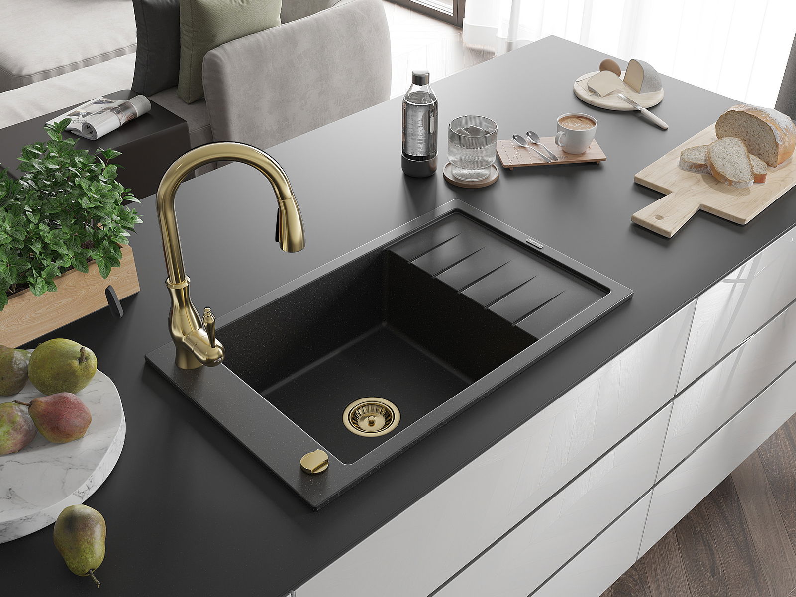 Mexen Elias granitā izlietne ar vienu nodalījumu un notecētavu, kā arī virtuves jaucējkrāns Savita, melns/sudraba