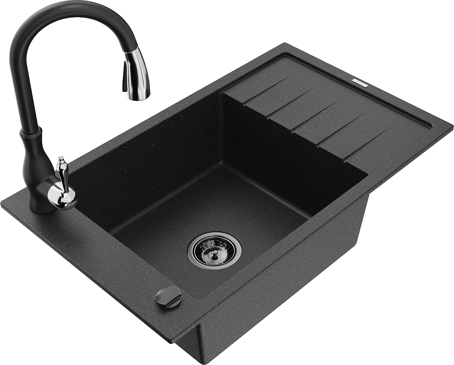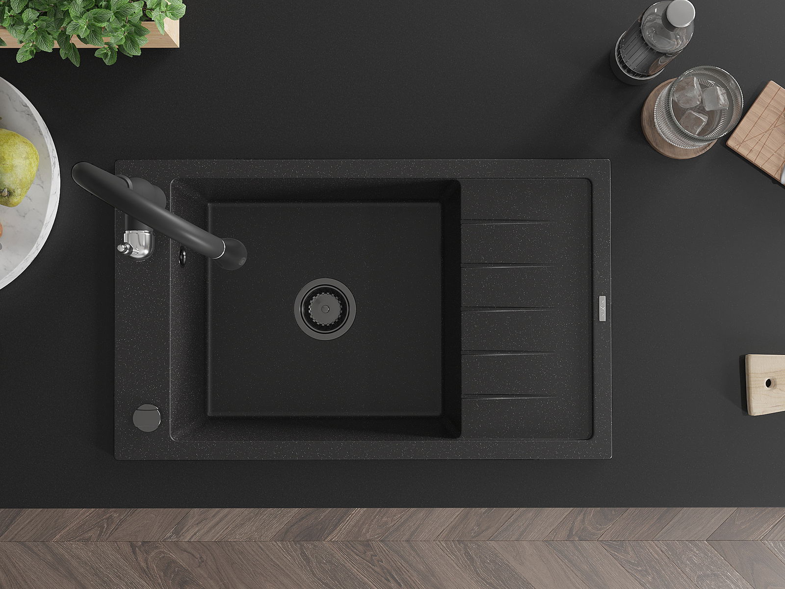 Mexen Elias granit izlietne ar vienu nodalījumu un noteka un virtuves krānu Savita, melna/sudraba metālika