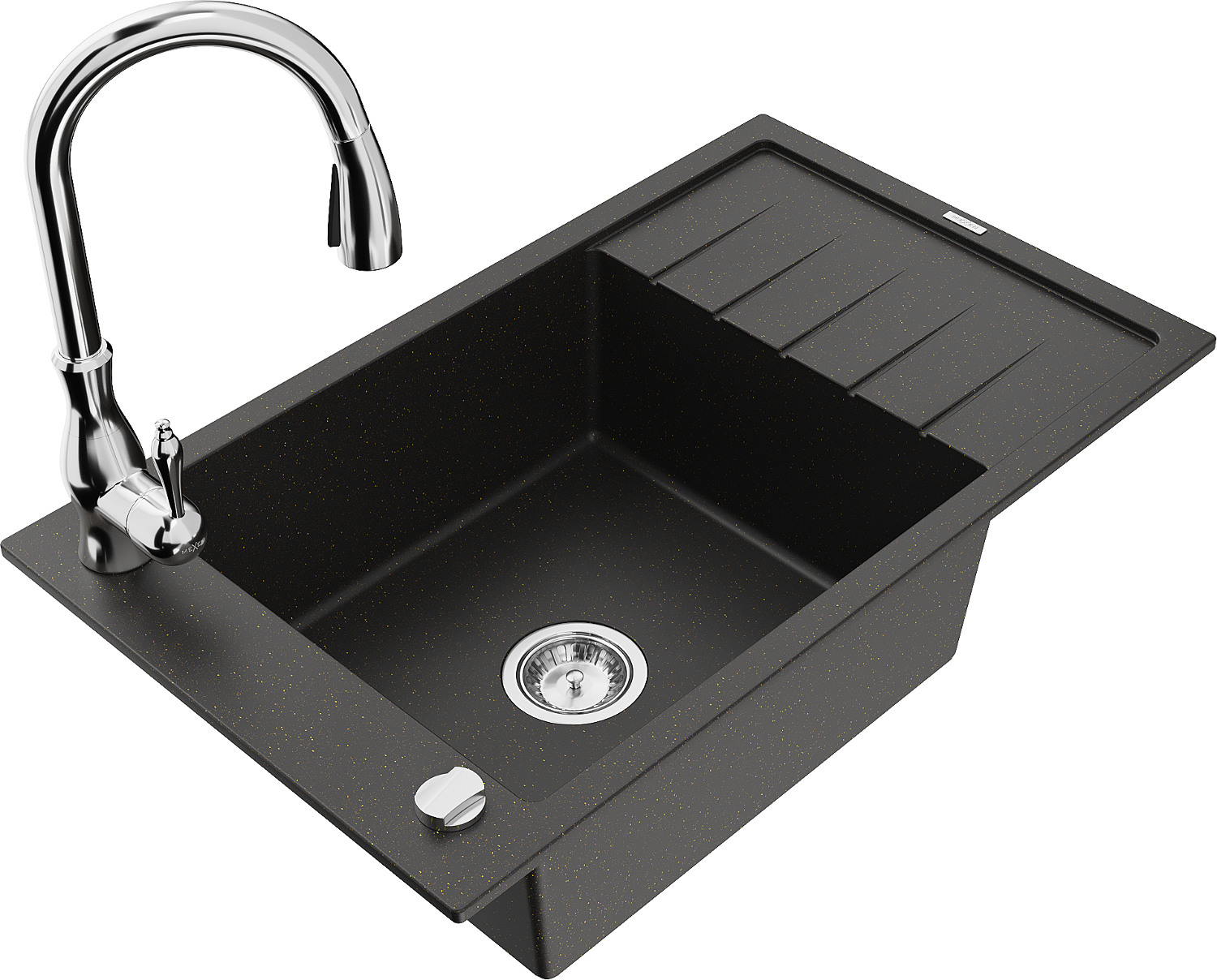 Mexen Elias granitais izlietne ar vienu nodalījumu, ar piledzi un virtuves jaucējkrānu Savita, melna/zelta metālika