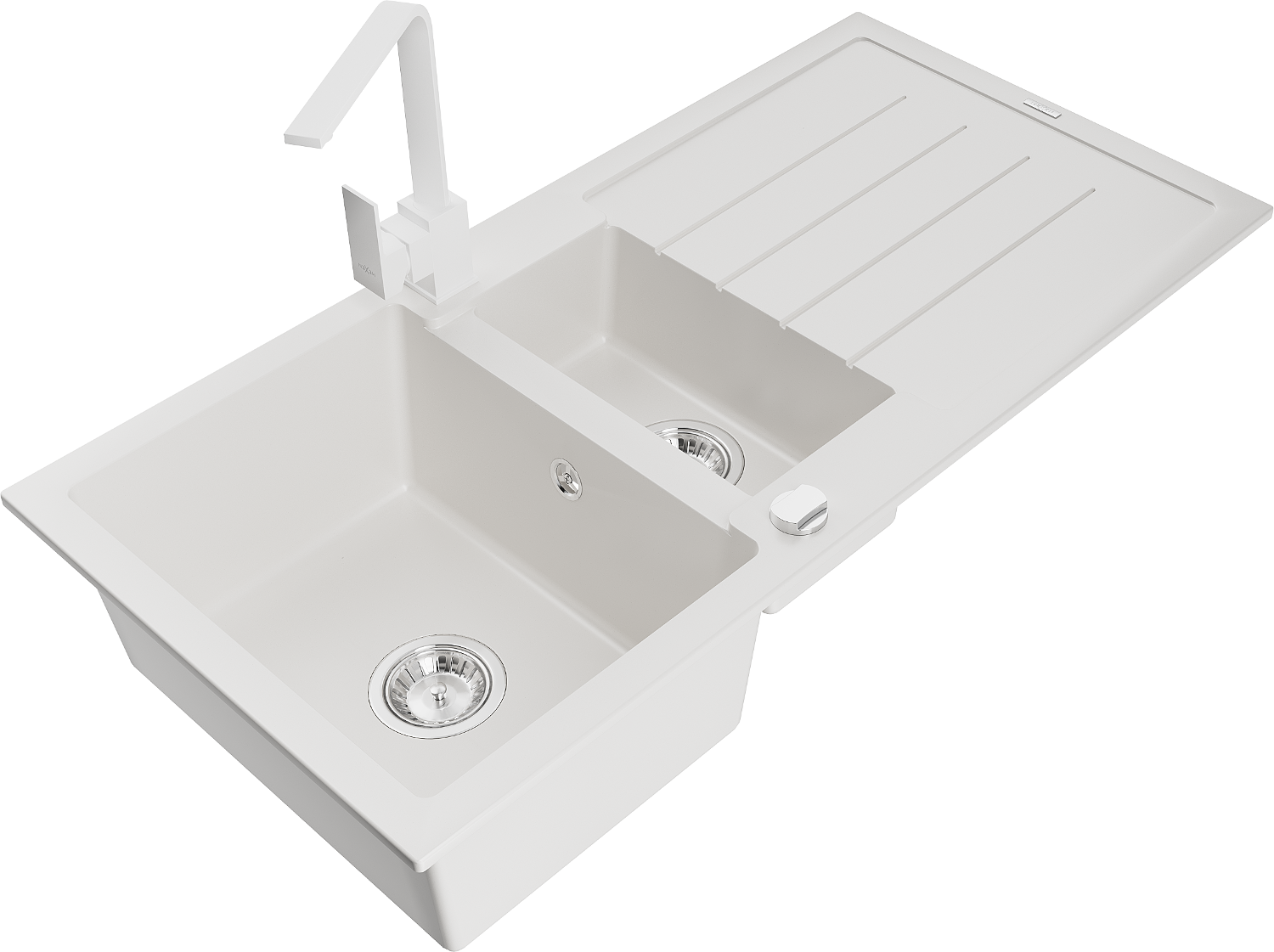 Mexen Andres granīta izlietne 1,5 nodalījumu ar notecinātāju un virtuves jaucējkrānu Rita, balta - 6515-20-670300-20