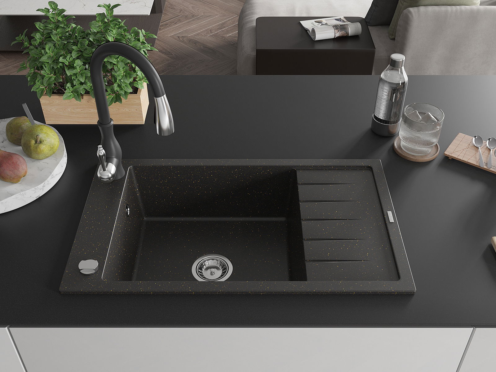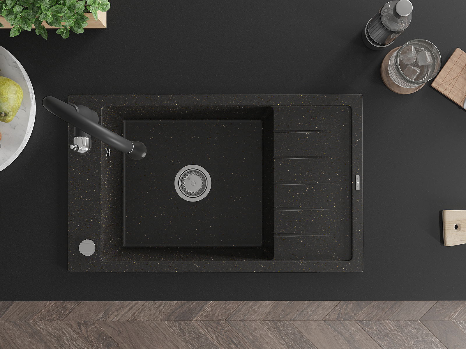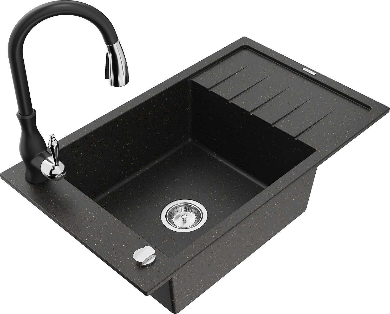 Mexen Elias 1 nodalījuma granīta izlietne ar notekpaplāti un virtuves jaucējkrānu Savita, melna/zeltīta metālika