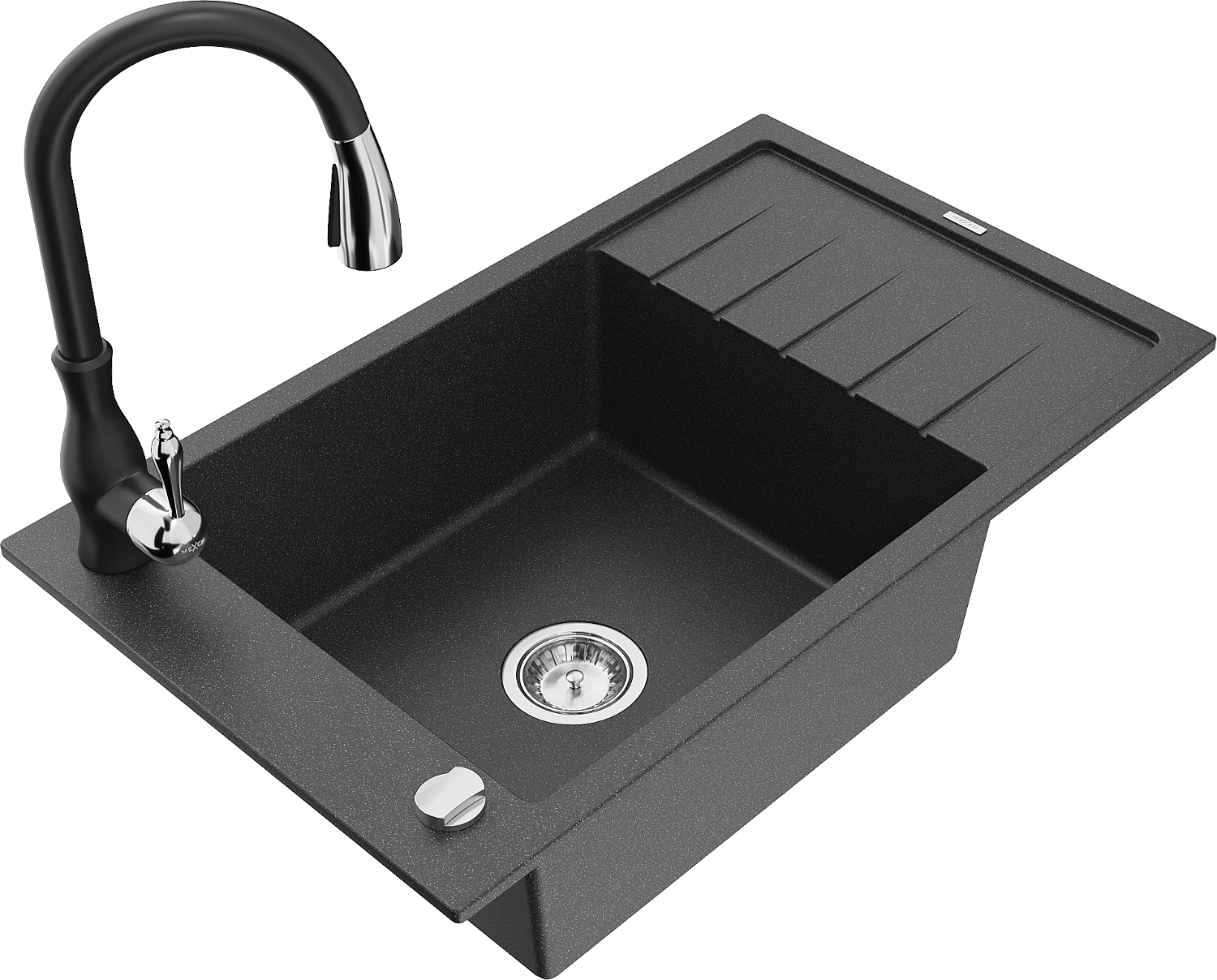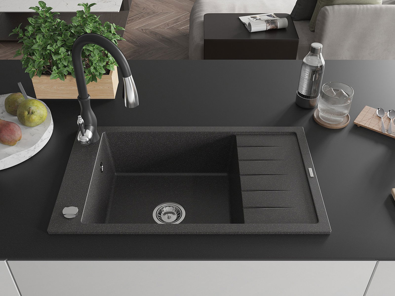 Mexen Elias Granit izlietne ar vienu nodalījumu, notecinātāju un virtuves jaucējkrānu Savita, melns ar punktiem