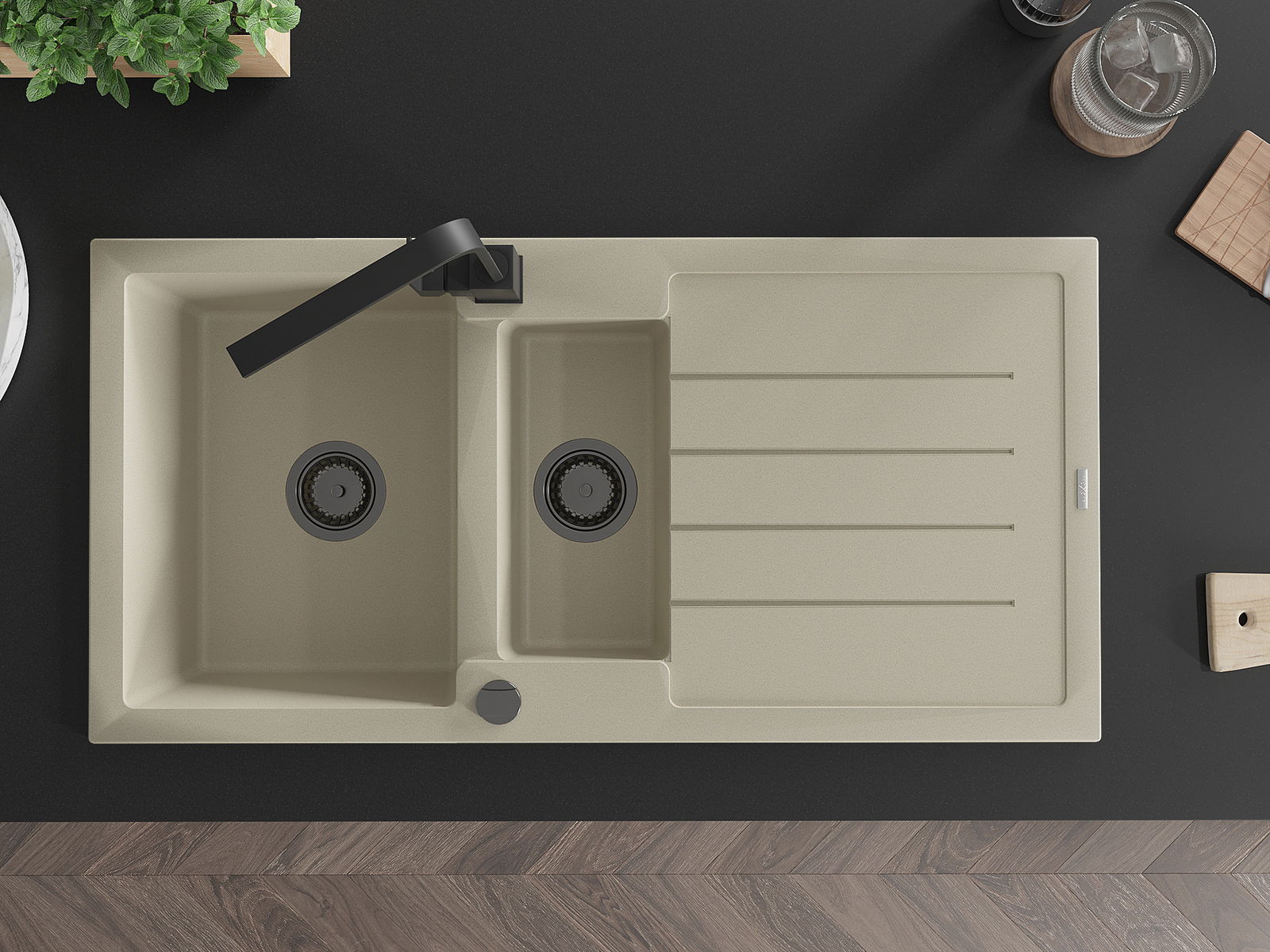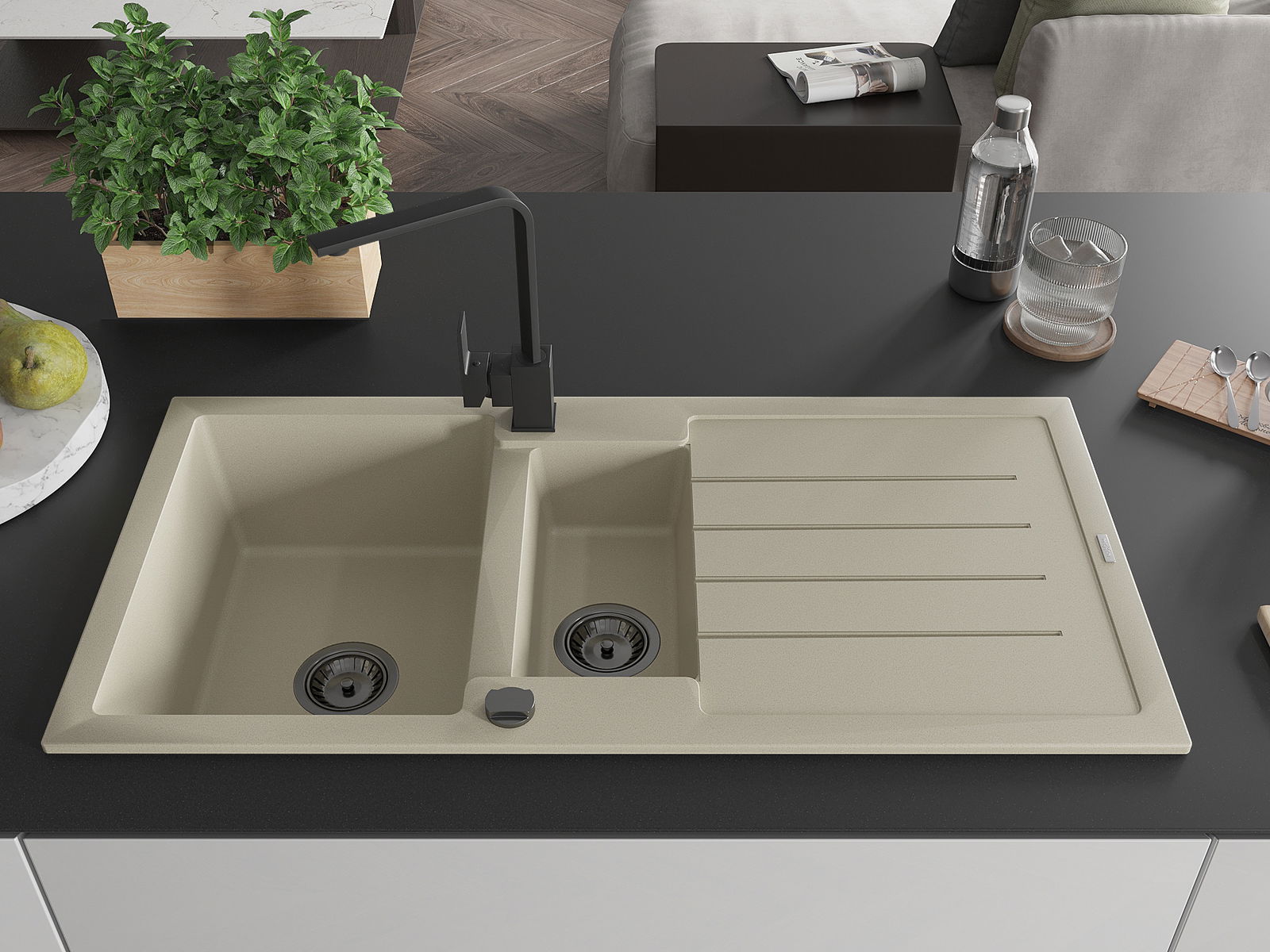 Mexen Andres granīta izlietne ar 1,5 nodalījumu un noteci, virtuvē ar Ritas krānu, bēša - 6515-69-670300-70