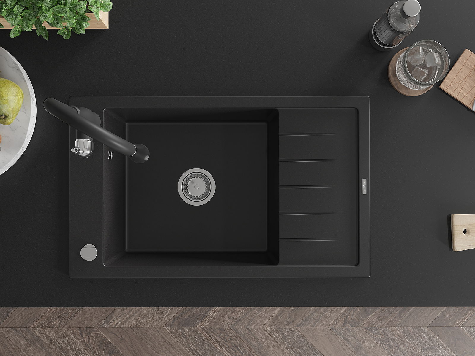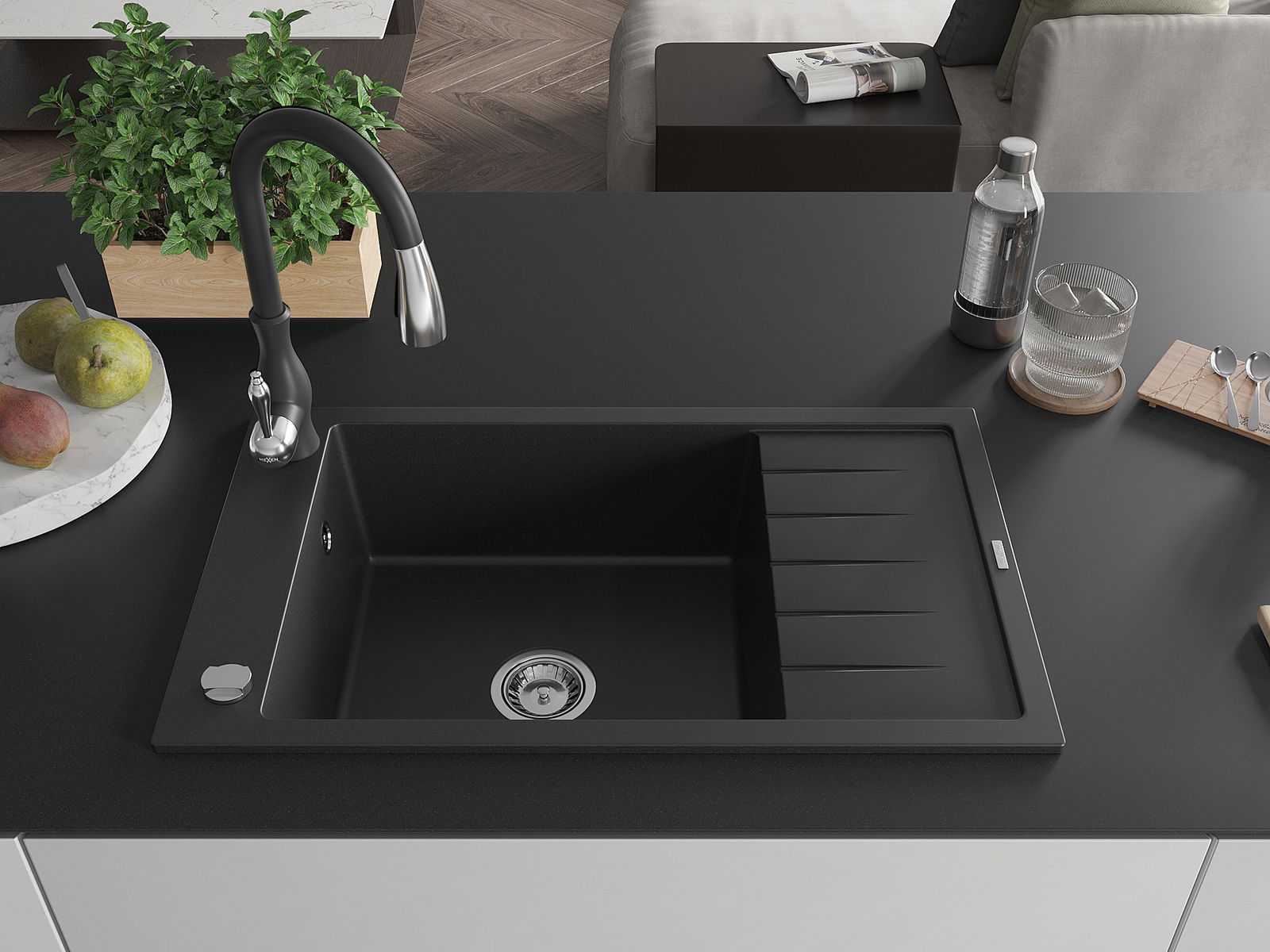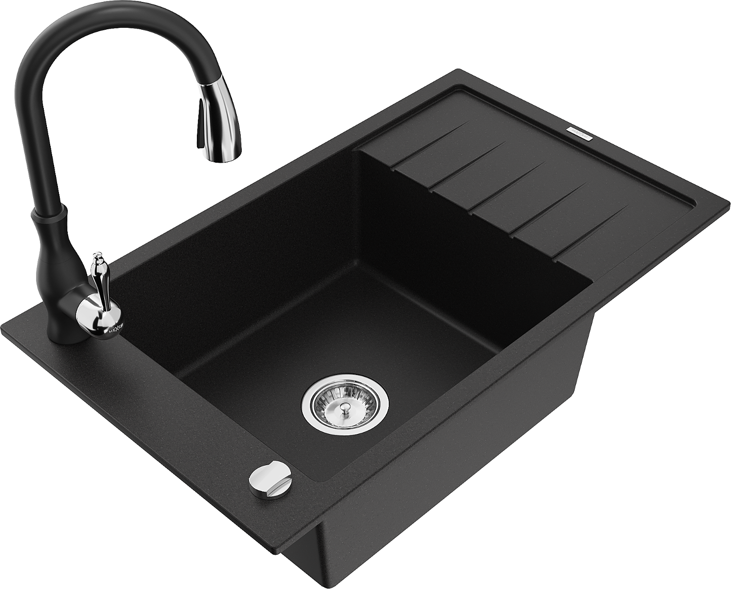 Mexen Elias granitē izlietne ar vienu nodalījumu, noteces virsmu un virtuves jaucējkrānu Savita, melna - 6511-77-672601-70