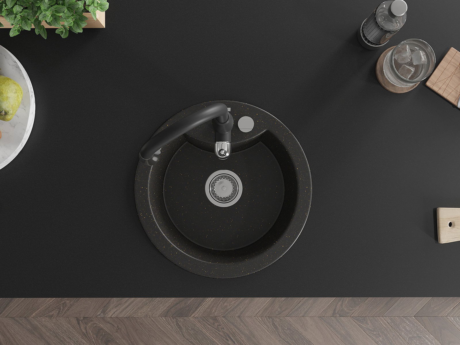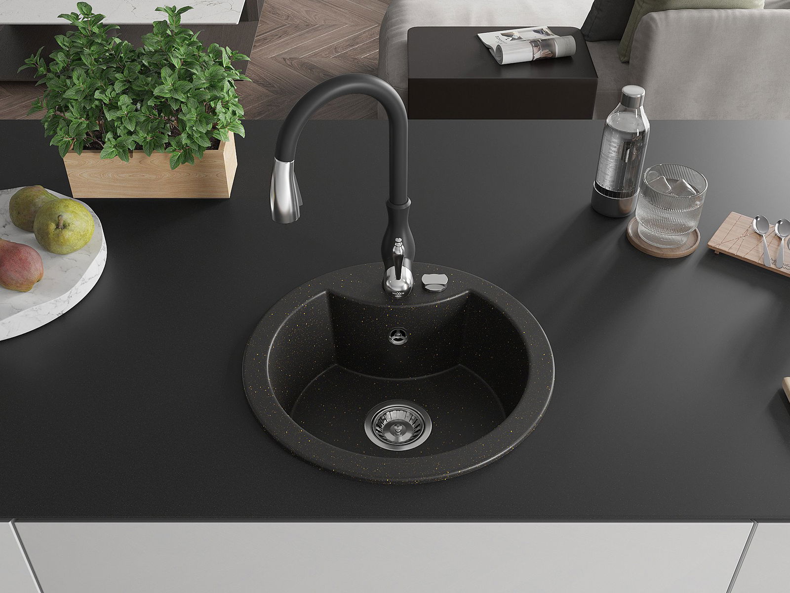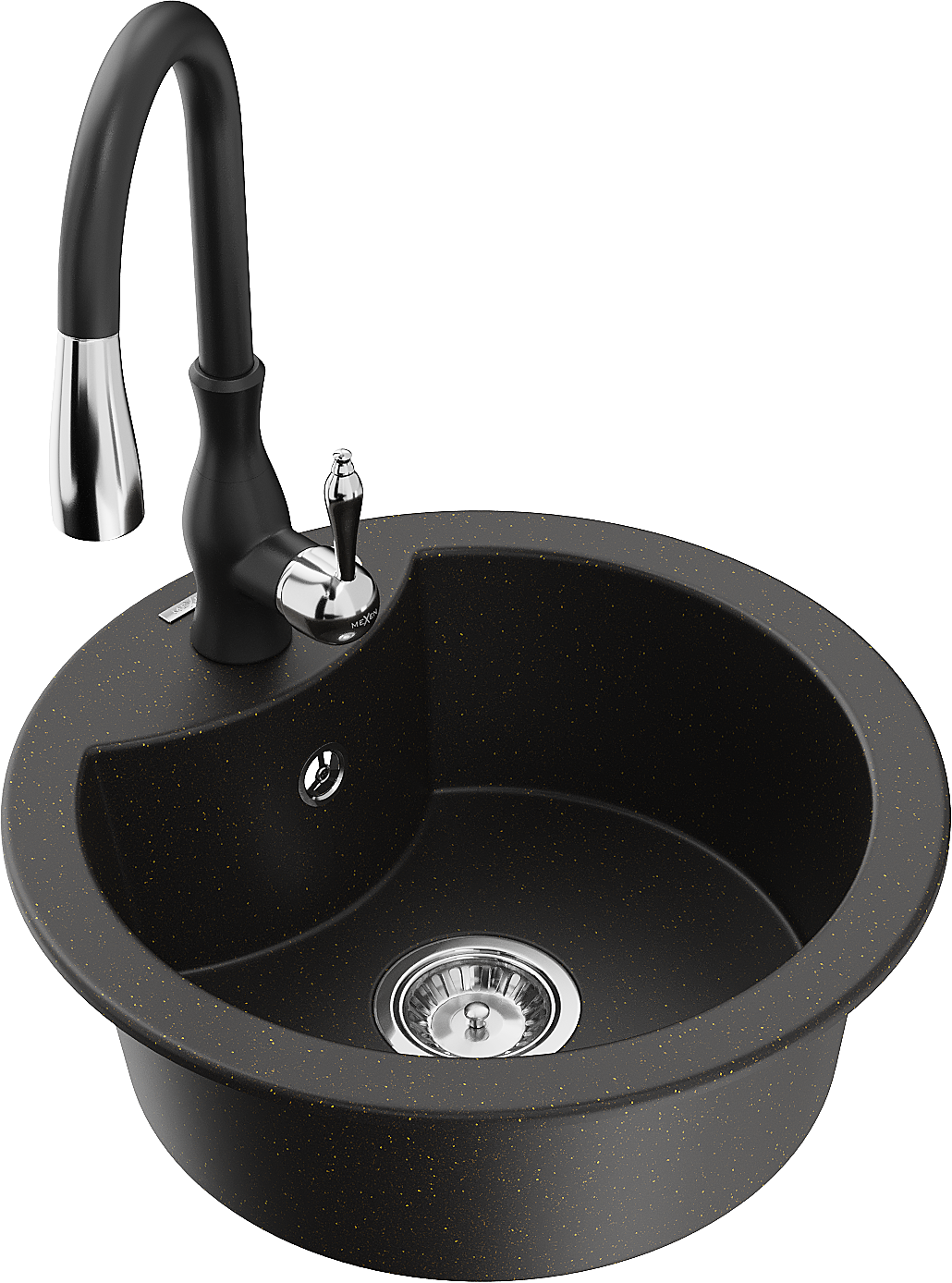 Mexen Diego granitizlietne ar vienu nodalījumu un virtuves jaucējkrānu Savita, melna/zeltīta metālika - 6512-75-672601-70