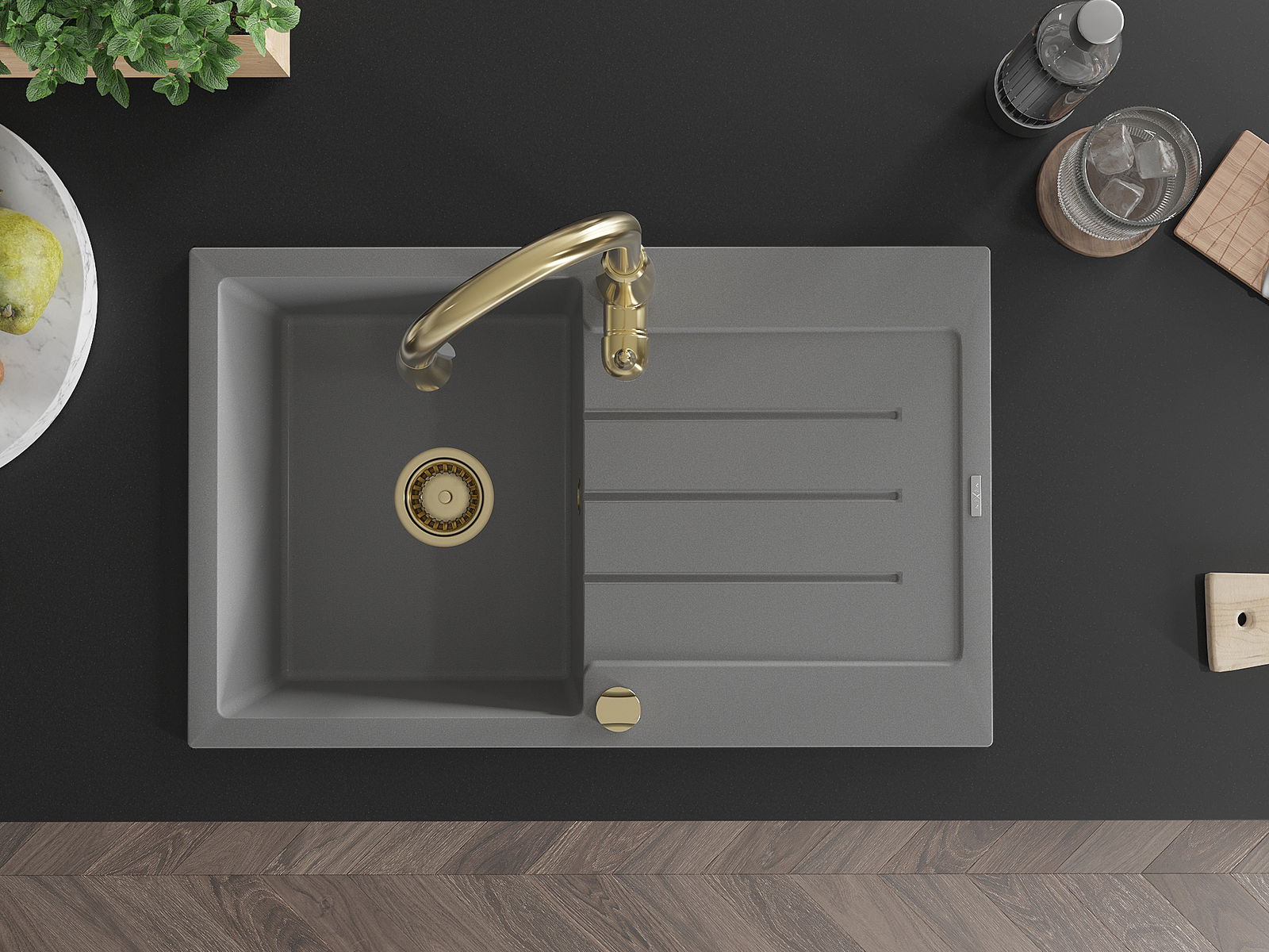 Mexen Bruno granitizlietne 1-nodalīts ar noteces paneli un virtuves jaucējkrānu Savita, pelēks - 6513-71-672601-50